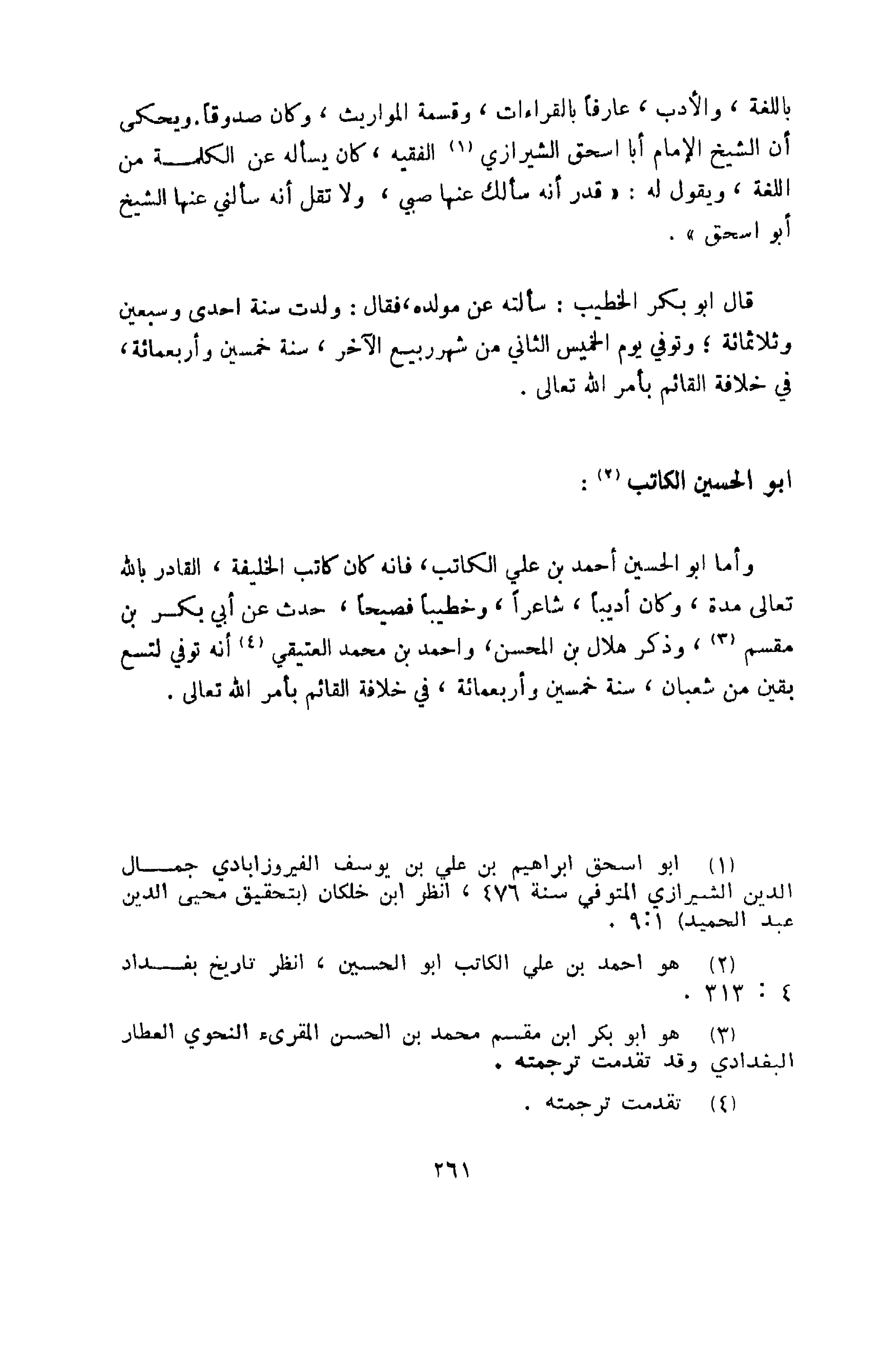 وأما أبو الحسين أحمد بن علي الكاتب، فإنه كان كاتب الخليفة القادر بالله تعالى مدة. وكان أديباً شاعراً، وخطيباً فصيحاً، حدث عن أبي بكر بن مقسم.