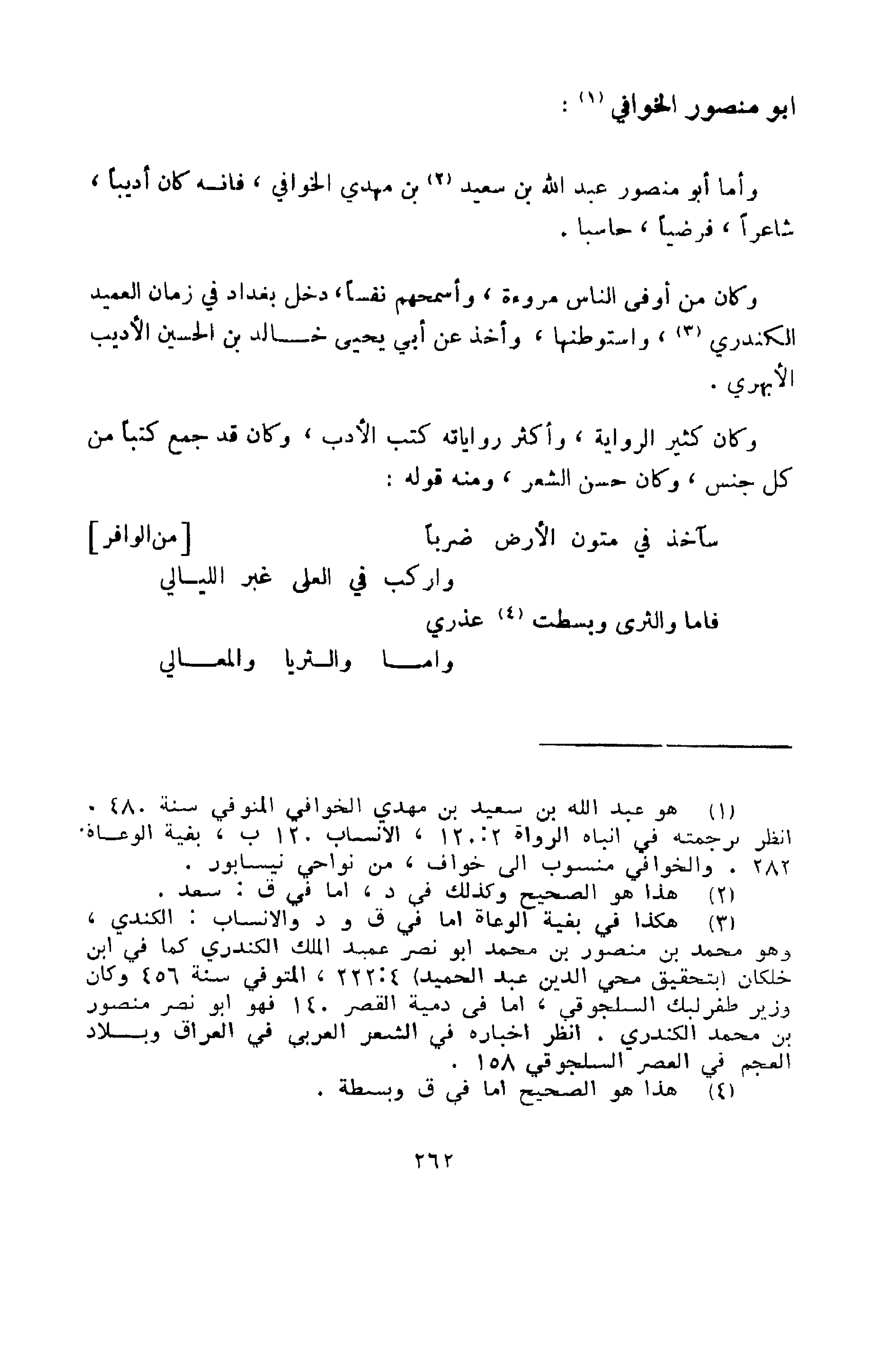 وأما أبو منصور عبد الله بن سعد بن مهدي الخوافي، فإنه كان أديباً شاعراً، فرضياً حاسباً، وكان من أوفى الناس مروءة، وأسمحهم نفساً، دخل بغداد في زمان العميد الكندري، واستوطنها.