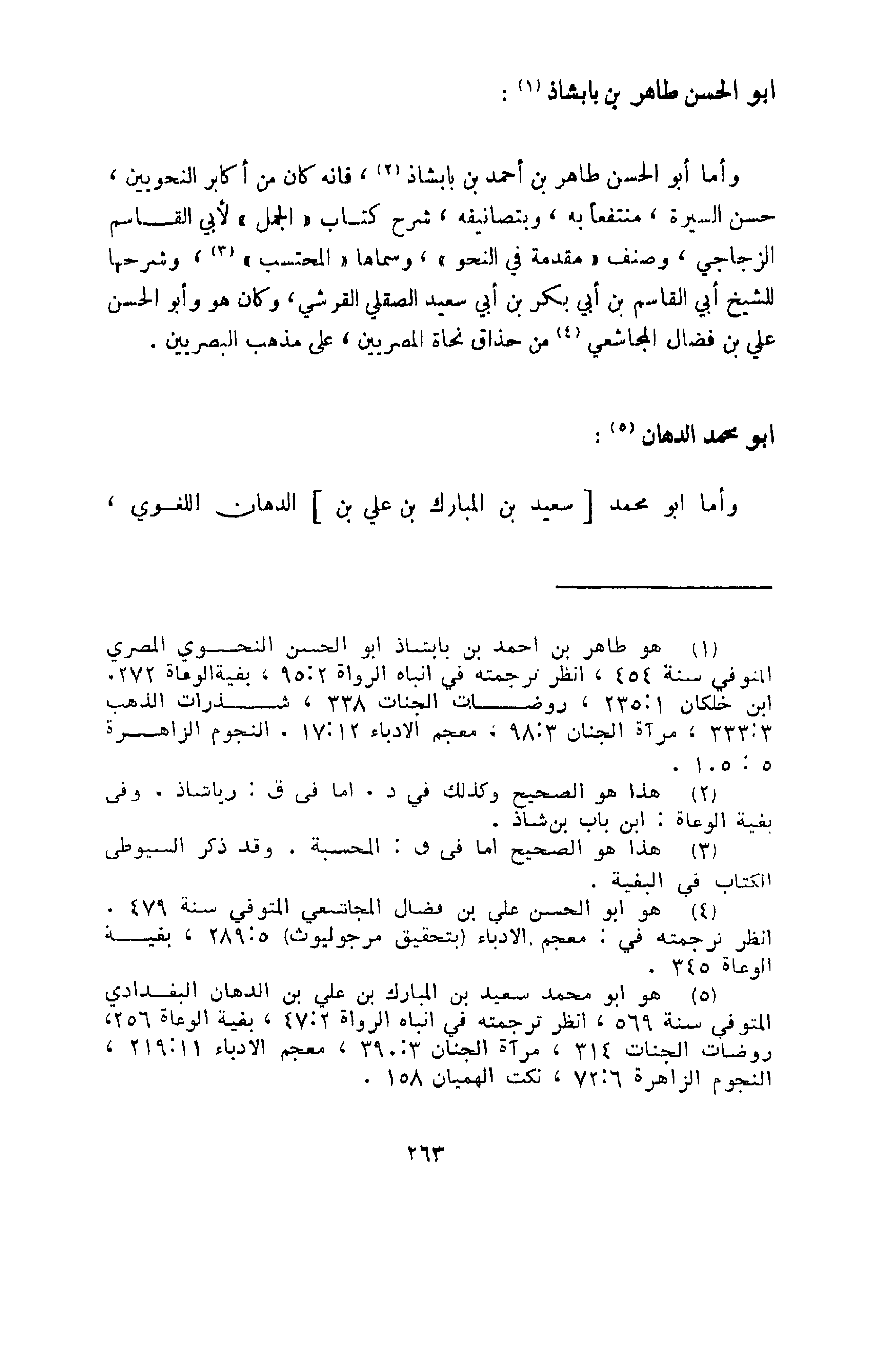 وأما أبو الحسن طاهر بن أحمد بن بابشاذ، فإنه كان من أكابر النحويين، حسن السيرة، منتفعاً به وبتصانيفه.