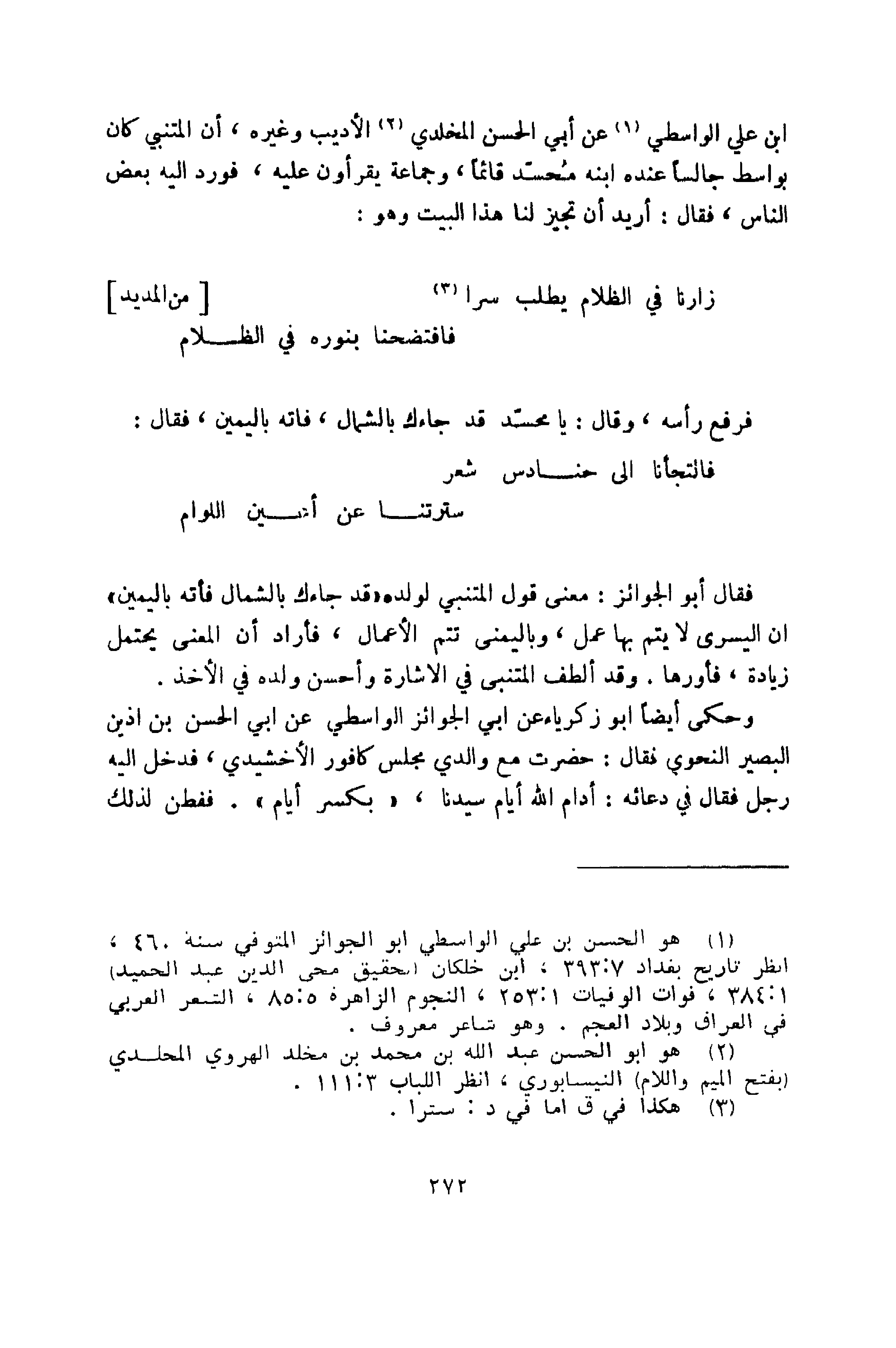 بن علي الواسطي، عن أبي الحسن المخلدي الأديب وغيره، أن المتنبي كان بواسط جالساً؛ وعنده ابنه محسد قائماً، وجماعة يقرؤون عليه، فورد إليه بعض الناس، فقال له، أريد أن يجيز لنا هذا البيت، وهو: