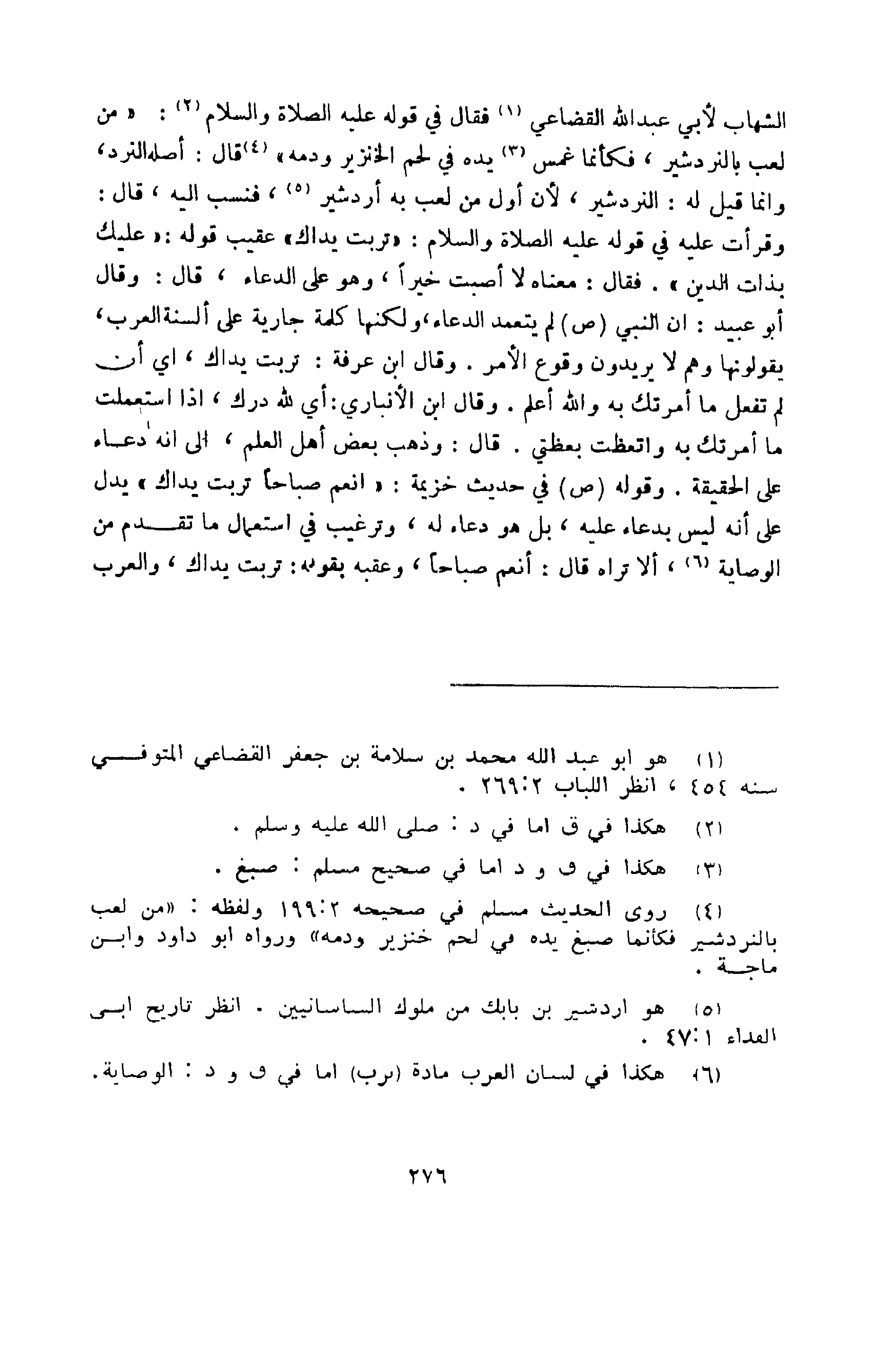 الشهاب لأبي عبد الله القضاعي، فقال في قوله عليه الصلاة والسلام: "مَن لعب بالنرد شير، فكأنما غمس يده في لحم الخنزير ودمه"، قال: أصله النرد، وإنما قيل له: النردشير؛ لأن أول من لعب به أردشير، فنسب إليه.