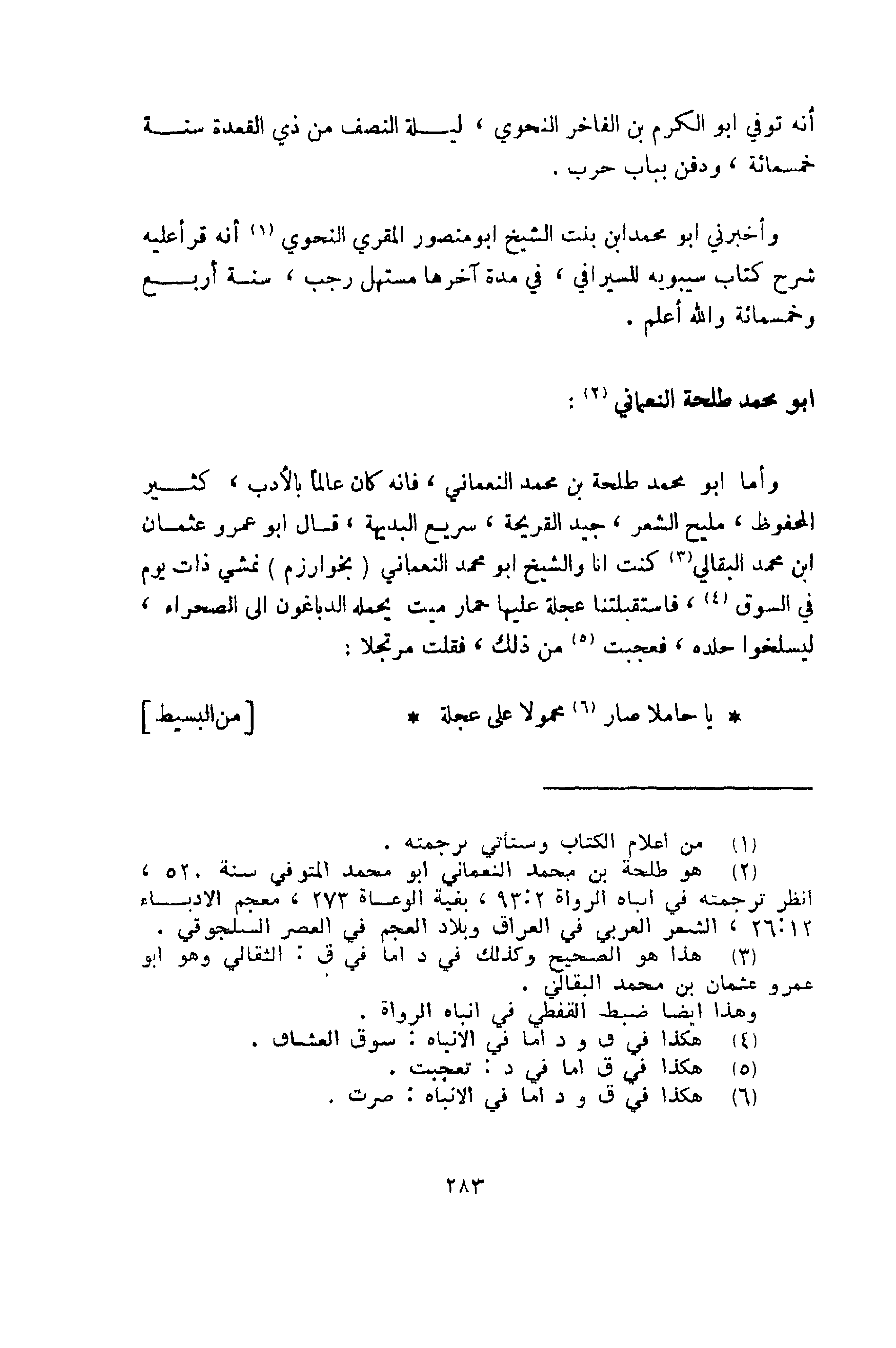 وأما أبو محمد طلحة بن محمد النعماني، فإنه كان عالماً بالأدب. كثير المحفوظ، مليح الشعر، جيد القريحة، سريع البديهة.