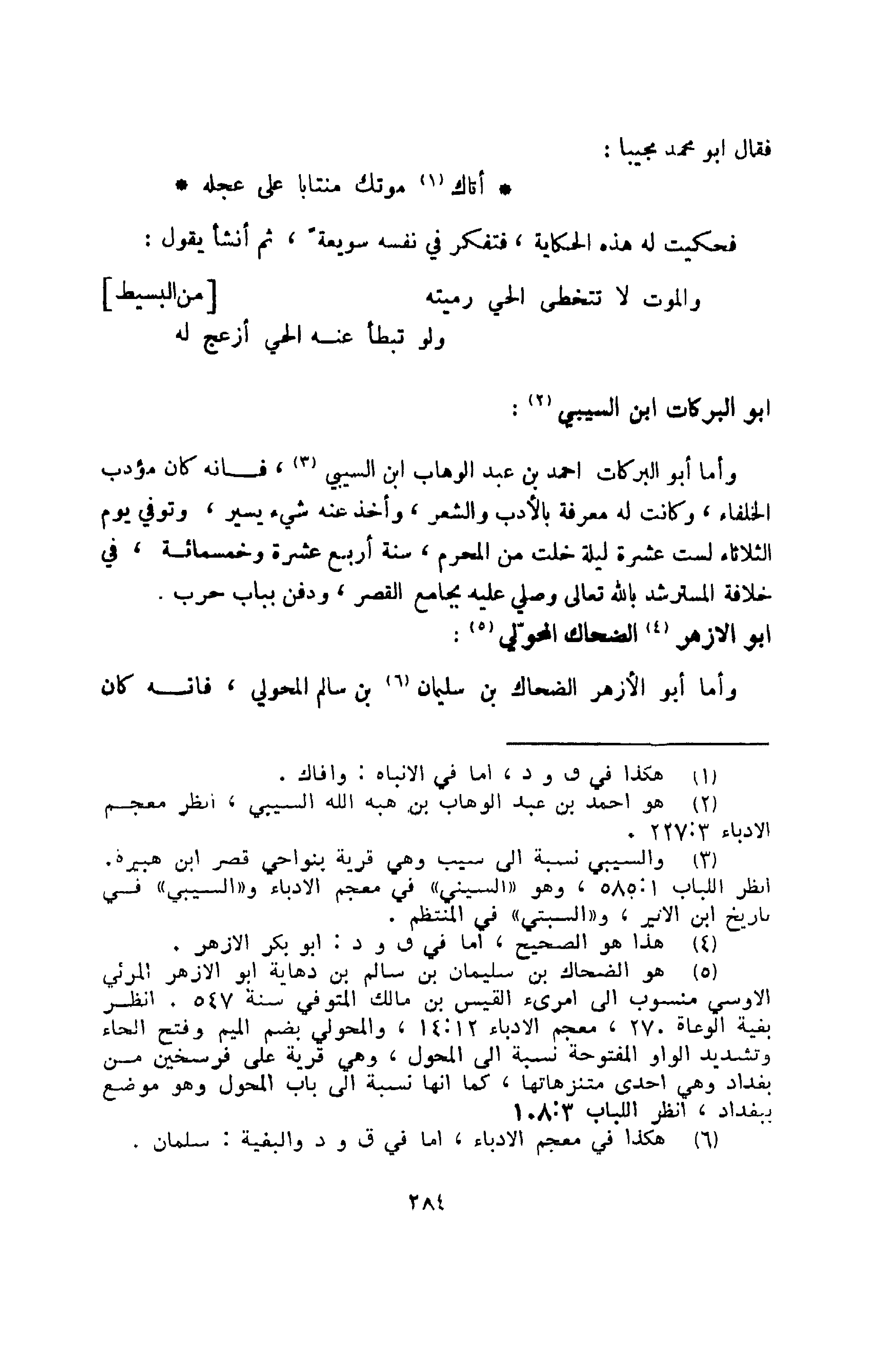 وأما أبو البركات أحمد بن عبد الوهاب بن السيبي، فإنه كان مؤدب الخلفاء، وكانت له معرفة بالأدب والشعر، وأخذ عنه شيء يسير.