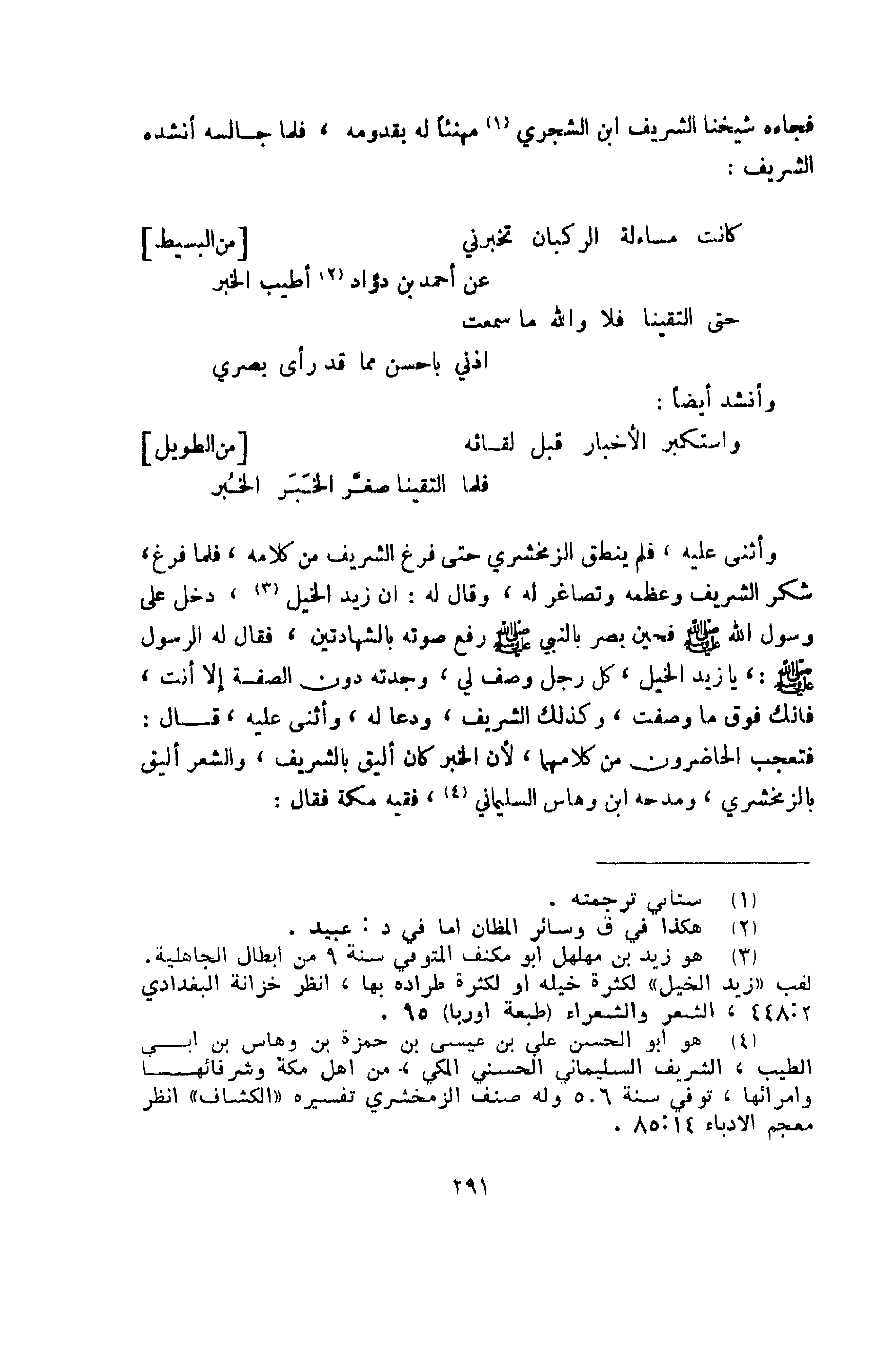 وأثنى عليه، ولم ينطق الزمخشري حتى فرغ الشريف من كلامه، فلما فرغ، شكر الشريف وعظمه وتصاغر له، وقال: إن زيد الخيل دخل على رسول الله صَلَّى اللهُ عَلَيْهِ وَسَلَّمَ، فحين بصر النبي صَلَّى اللهُ عَلَيْهِ وَسَلَّمَ رفع صوته بالشهادة، فقال له الرسول صَلَّى اللهُ عَلَيْهِ وَسَلَّمَ: "يا زيد الخيل، كل رجل وصف لي وجدته دون الصفة، إلا أنت، فإنك فوق ما وصفت". وكذلك الشريف، ودعا له، وأثنى عليه. قال: فعجب الحاضرون من كلامهما؛ لأن الخبر كان أليق بالشريف، والشعر أليق بالزمخشري.