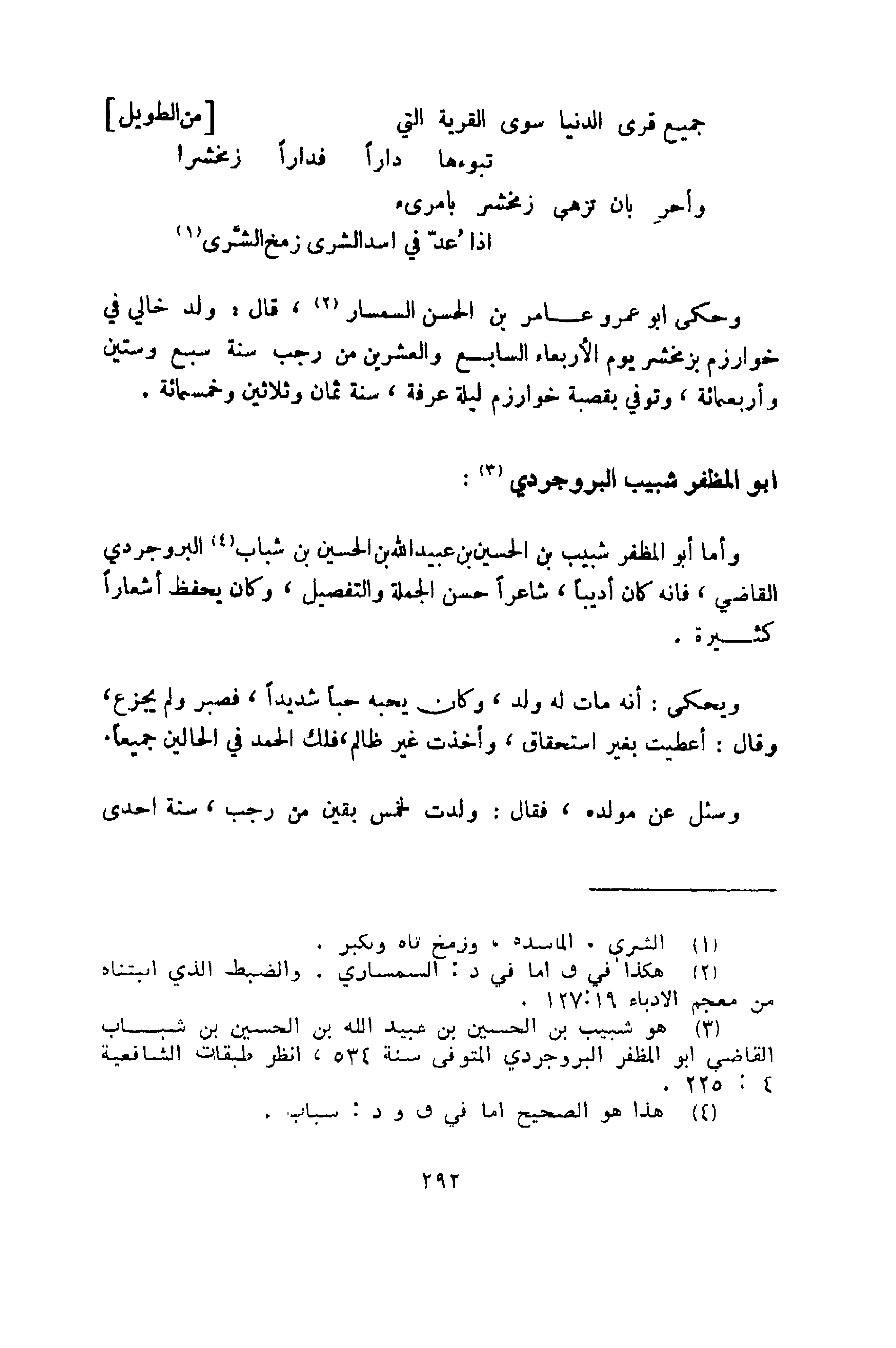 وأما أبو المظفر شبيب بن الحسين بن عبيد الله بن الحسين بن سباب البروجردي القاضي، فإنه كان أديباً شاعراً، حسن الجملة والتفصيل، وكان يحفظ أشعاراً كثيرة.