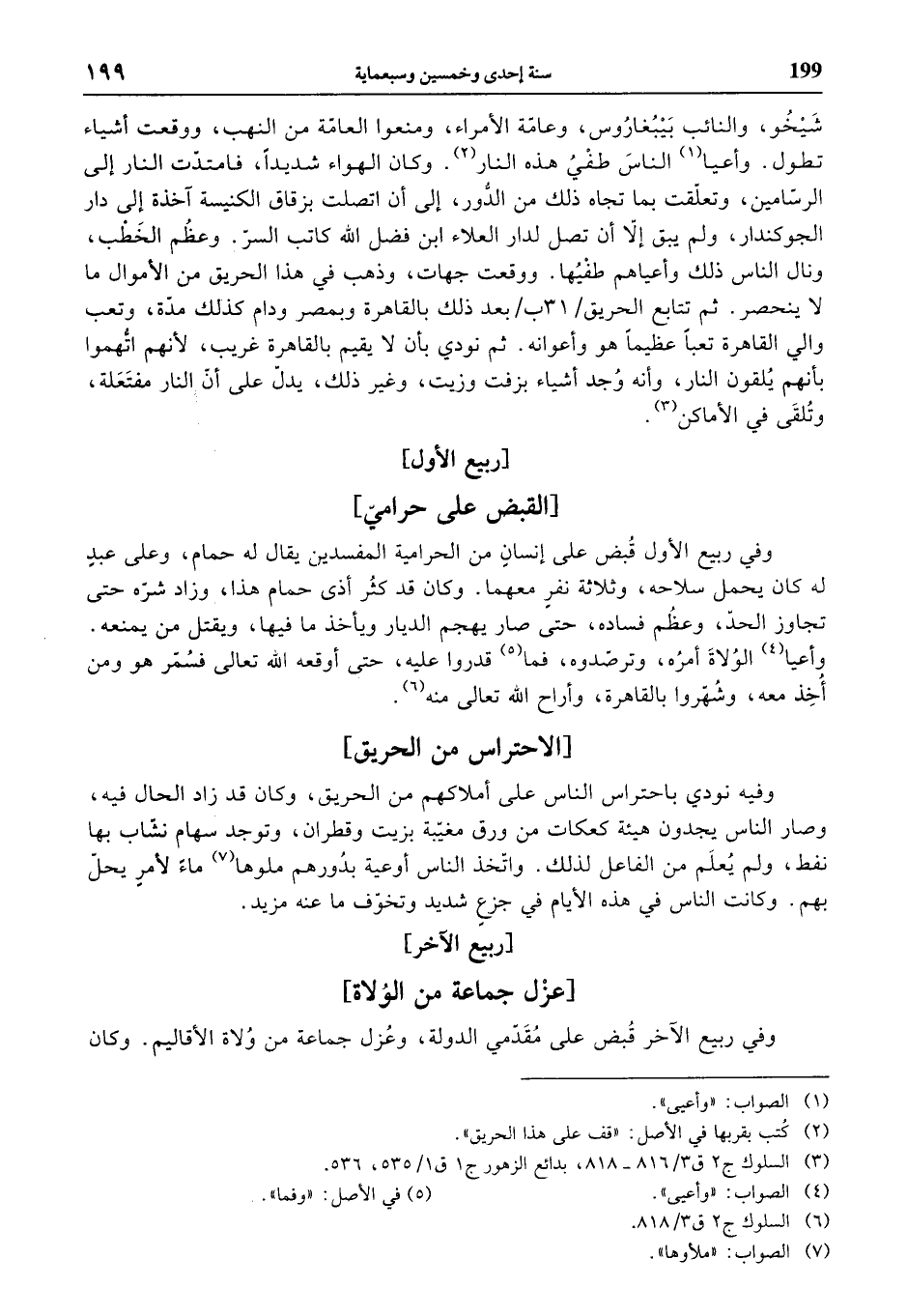 وفي ربيع الأول قبض على إنسان من الحرامية المفسدين يقال له حمام، وعلى عبد له كان يحمل سلاحه، وثلاثة نفر معهما. وكان قد كثر أذى حمام هذا، وزاد شرّه حتى تجاوز الحدّ، وعظم فساده، حتى صار يهجم الديار ويأخذ ما فيها، ويقتل من يمنعه. وأعيا (¬4) الولاة أمره، وترصّدوه، فما (¬5) قدروا عليه، حتى أوقعه الله تعالى فسمّر هو ومن أخذ معه، وشهّروا بالقاهرة، وأراح الله تعالى منه (¬6).