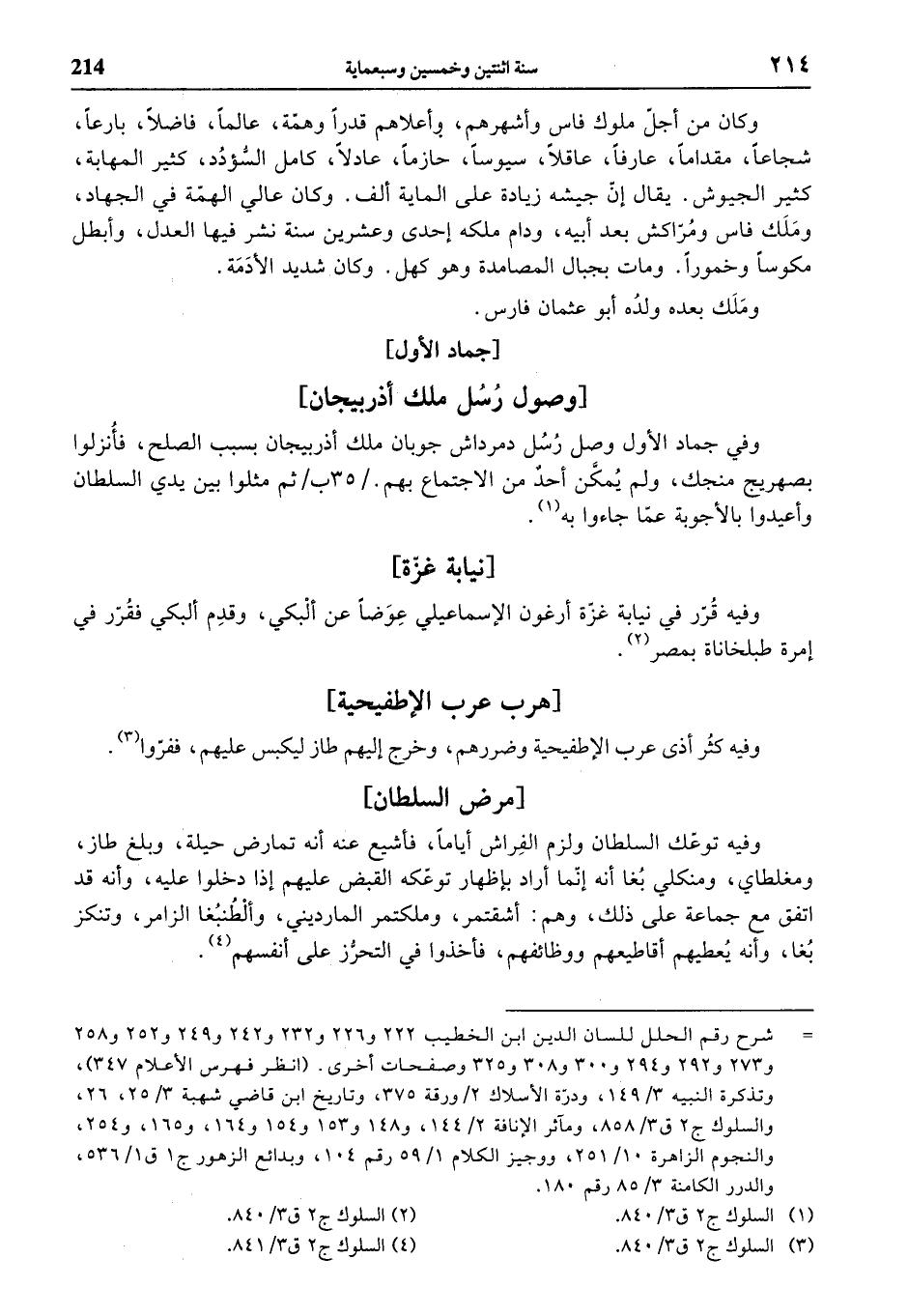 وفي جماد الأول وصل رسل دمرداش جوبان ملك أذربيجان بسبب الصلح، فأنزلوا بصهريج منجك، ولم يمكّن أحد من الاجتماع بهم. / 35 ب / ثم مثلوا بين يدي السلطان وأعيدوا بالأجوبة عمّا جاءوا به (¬1).