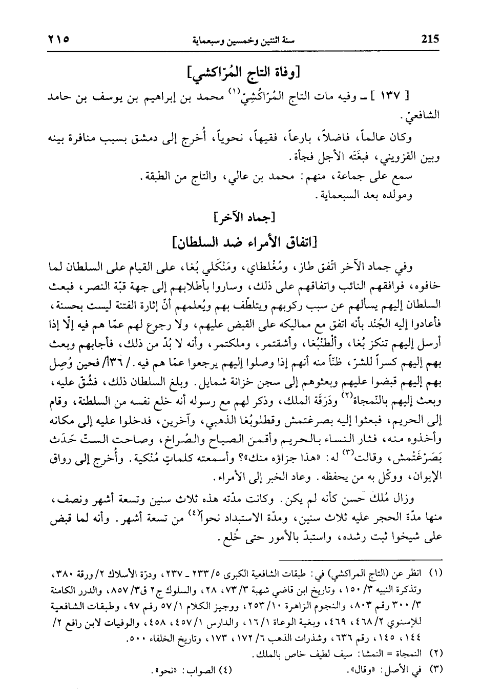 (¬1) انظر عن (التاج المراكشي) في: طبقات الشافعية الكبرى 5/ 233 - 237، ودرّة الأسلاك 2 / ورقة 380، وتذكرة النبيه 3/ 150، وتاريخ ابن قاضي شهبة 3/ 73، 28، والسلوك ج 2 ق 3/ 857، والدرر الكامنة 3/ 300 رقم 803، والنجوم الزاهرة 10/ 253، ووجيز الكلام 1/ 57 رقم 97، وطبقات الشافعية للإسنوي 2/ 468، 469، وبغية الوعاة 1/ 16، والدارس 1/ 457، 458، والوفيات لابن رافع 2/ 144، 145، رقم 636، وشذرات الذهب 6/ 172، 173، وتاريخ الخلفاء 500.