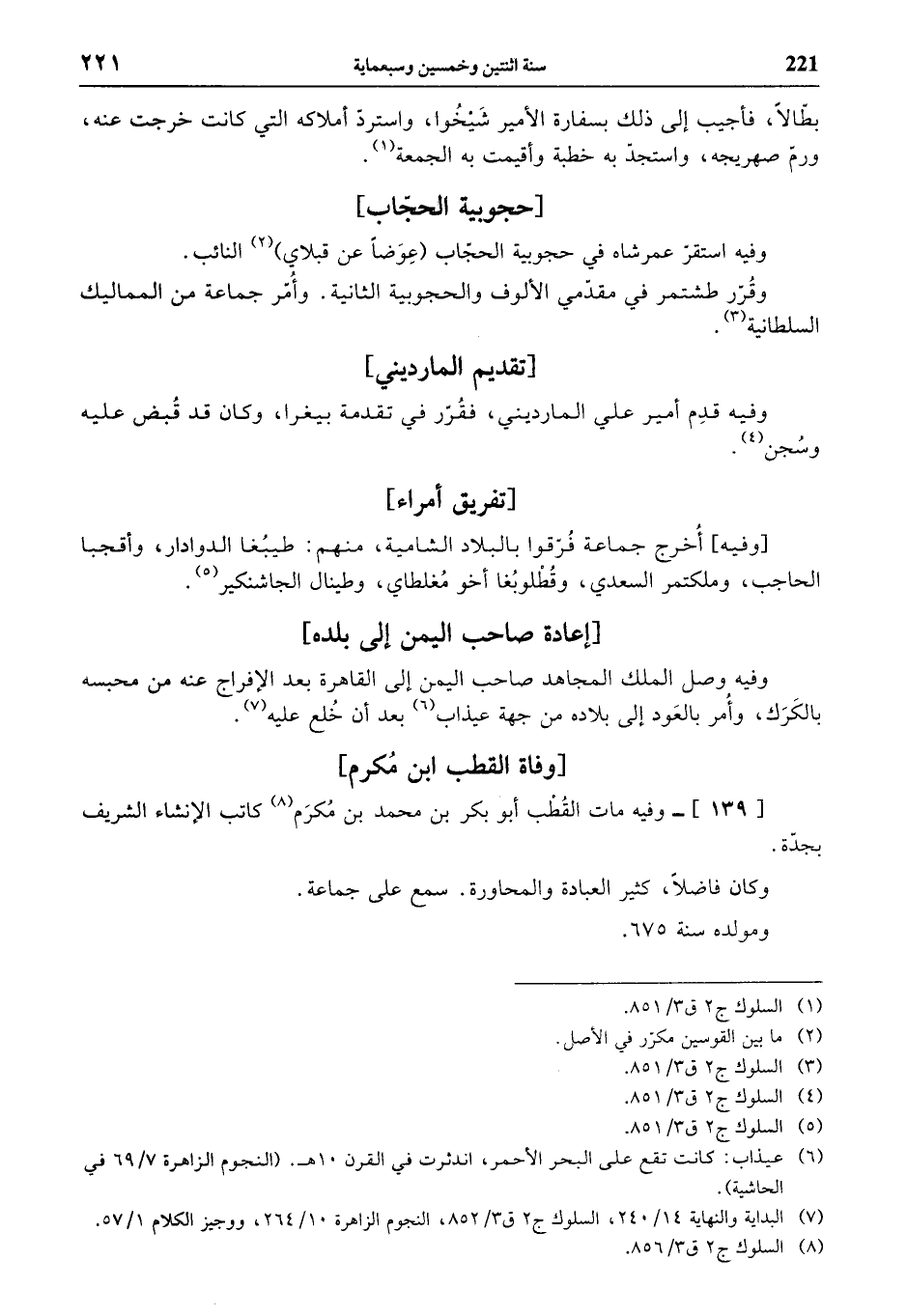 (¬7) البداية والنهاية 14/ 240، السلوك ج 2 ق 3/ 852، النجوم الزاهرة 10/ 264، ووجيز الكلام 1/ 57.