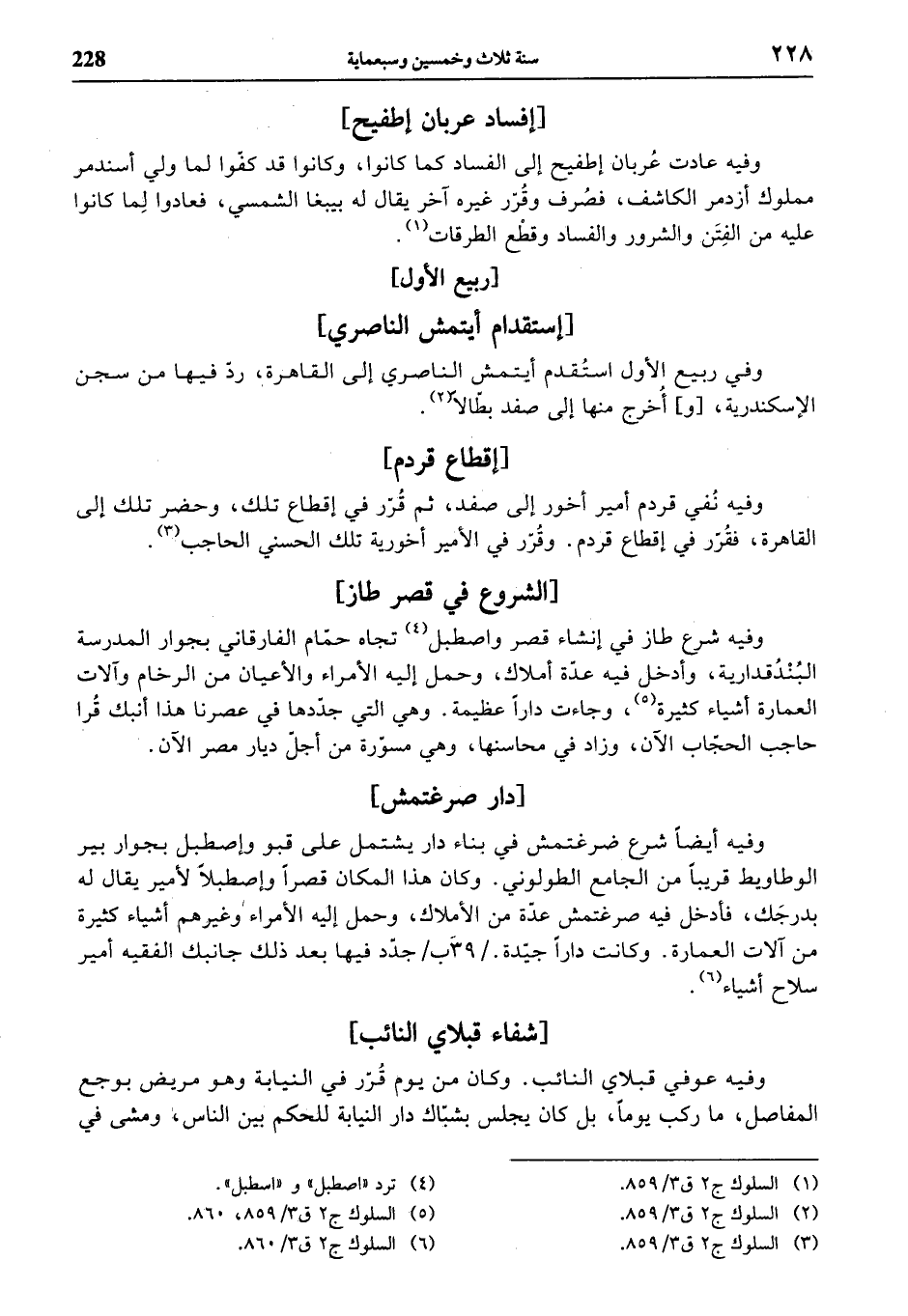 وفيه شرع طاز في إنشاء قصر واصطبل (¬4) تجاه حمّام الفارقاني بجوار المدرسة البندقدارية، وأدخل فيه عدّة أملاك، وحمل إليه الأمراء والأعيان من الرخام وآلات العمارة أشياء كثيرة (¬5)، وجاءت دارا عظيمة. وهي التي جدّدها في عصرنا هذا أنبك قرا حاجب الحجّاب الآن، وزاد في محاسنها، وهي مسوّرة من أجلّ ديار مصر الآن.