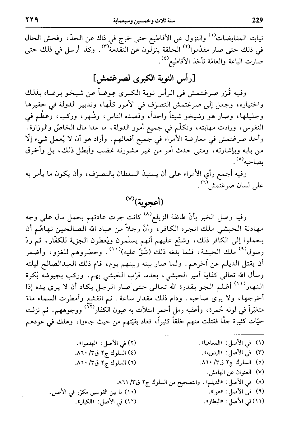 وفيه قرّر صرغتمش في الرأس نوبة الكبرى عوضا عن شيخو برضاه بذلك واختياره، وجعل إلى صرغتمش التصرّف في الأمور كلّها، وتدبير الدولة في حقيرها وجليلها، وصار هو وشيخو شيئا واحدا، وقصده الناس، وشهر، وركب، وعظم في النفوس، وزادت مهابته، وتكلّم في جميع أمور الدولة، ما عدا مال الخاصّ والوزارة. وأخذ صرغتمش في معارضة الأمراء في جميع أفعالهم. وأراد هو أن لا يعمل شيء إلاّ من بابه وبإشارته، ومتى حدث أمر من غير مشورته غضب وأبطل ذلك، بل وأخرق بصاحبه (¬5).