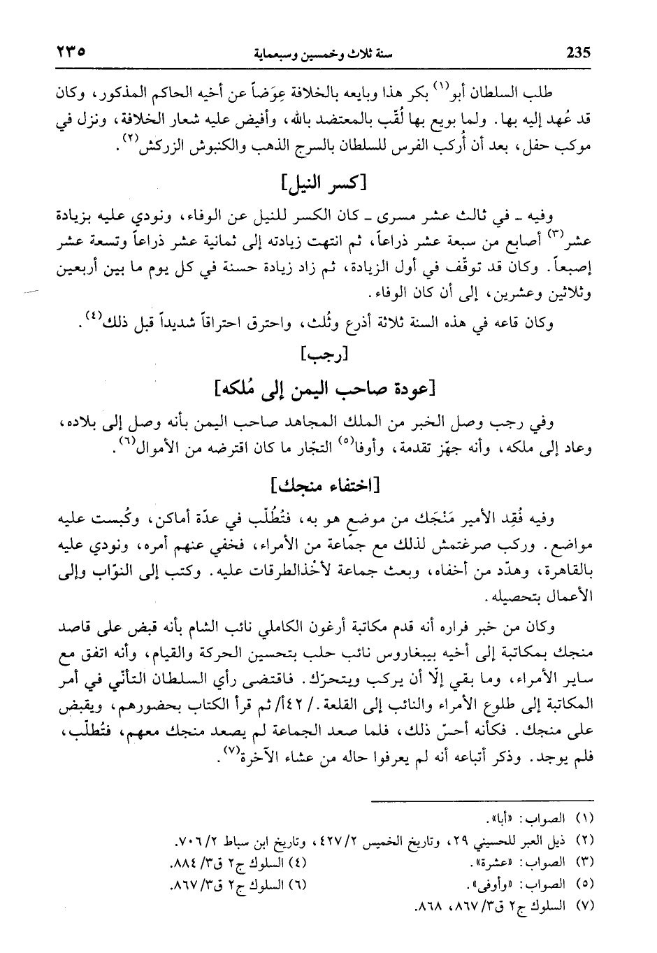 وكان من خبر فراره أنه قدم مكاتبة أرغون الكاملي نائب الشام بأنه قبض على قاصد منجك بمكاتبة إلى أخيه بيبغاروس نائب حلب بتحسين الحركة والقيام، وأنه اتفق مع ساير الأمراء، وما بقي إلاّ أن يركب ويتحرّك. فاقتضى رأي السلطان التأنّي في أمر المكاتبة إلى طلوع الأمراء والنائب إلى القلعة. / 42 أ / ثم قرأ الكتاب بحضورهم، ويقبض على منجك. فكأنه أحسّ ذلك، فلما صعد الجماعة لم يصعد منجك معهم، فتطلّب، فلم يوجد. وذكر أتباعه أنه لم يعرفوا حاله من عشاء الآخرة (¬7).