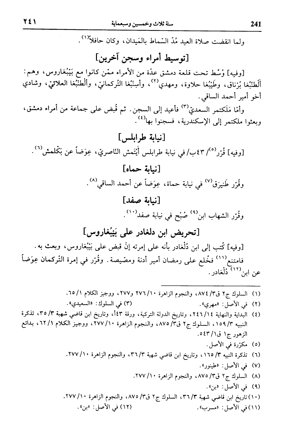 (¬4) البداية والنهاية 14/ 246، وتاريخ الدولة التركية، ورقة 43 أ، وتاريخ ابن قاضي شهبة 3/ 35، تذكرة النبيه 3/ 159، السلوك ج 2 ق 3/ 875، والنجوم الزاهرة 10/ 277، ووجيز الكلام 1/ 62، بدائع الزهور ج 1 ق 1/ 543.