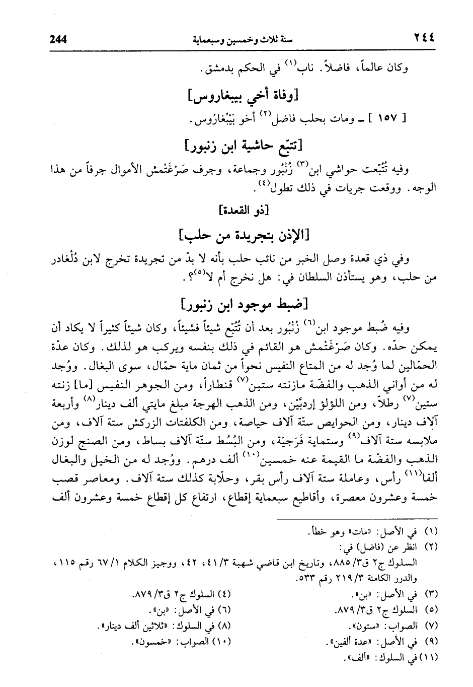 وفيه تتبّعت حواشي ابن (¬3) زنبور وجماعة، وجرف صرغتمش الأموال جرفا من هذا الوجه. ووقعت جريات في ذلك تطول (¬4).