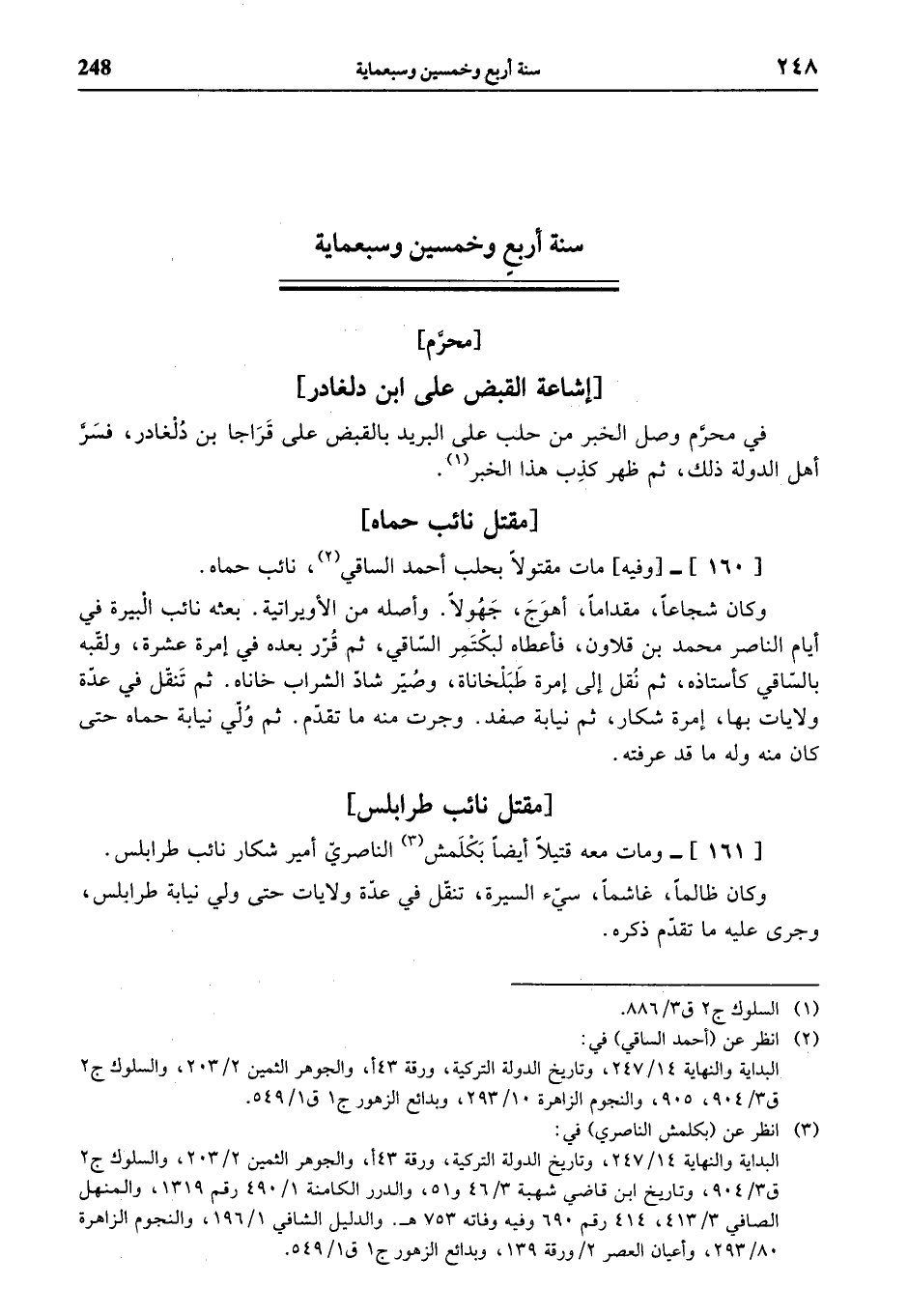 [160]-، [وفيه] مات مقتولا بحلب أحمد الساقي (¬2)، نائب حماه.