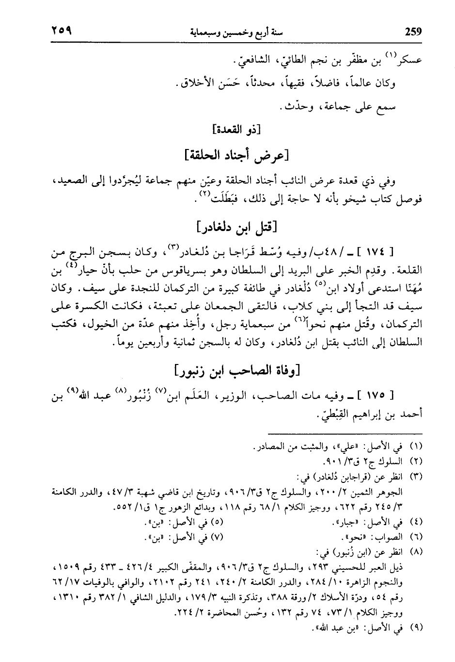 (¬8) انظر عن (ابن زنبور) في: ذيل العبر للحسيني 293، والسلوك ج 2 ق 3/ 906، والمقفّى الكبير 4/ 426 - 433 رقم 1509، والنجوم الزاهرة 10/ 284، والدرر الكامنة 2/ 240، 241 رقم 2102، والوافي بالوفيات 17/ 62 رقم 54، ودرّة الأسلاك 2 / ورقة 388، وتذكرة النبيه 3/ 179، والدليل الشافي 1/ 382 رقم 1310، ووجيز الكلام 1/ 73، 74 رقم 132، وحسن المحاضرة 2/ 224.