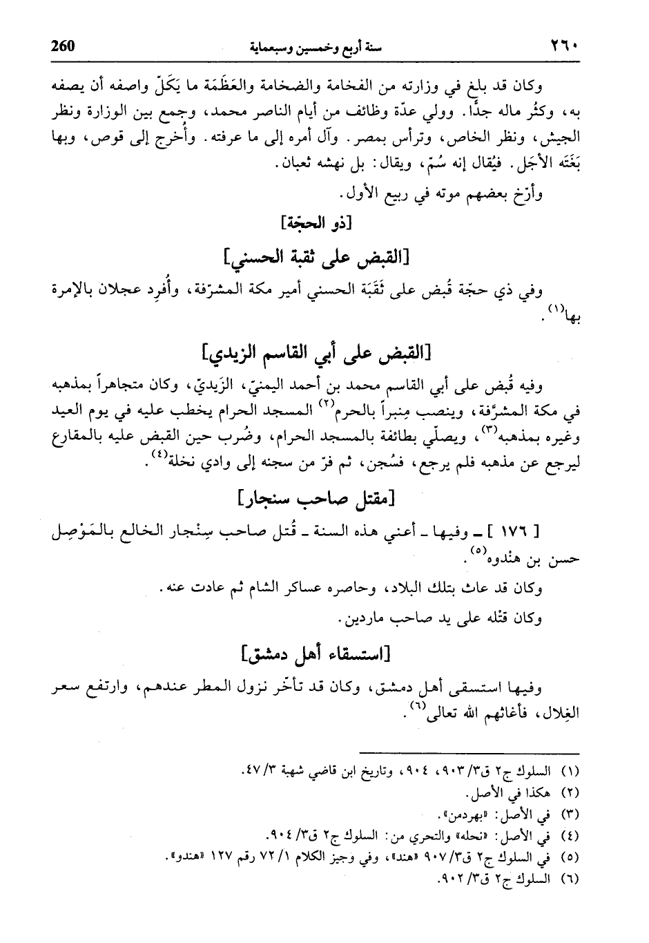 [176]- وفيها - أعني هذه السنة - قتل صاحب سنجار الخالع بالموصل حسن بن هندوه (¬5).