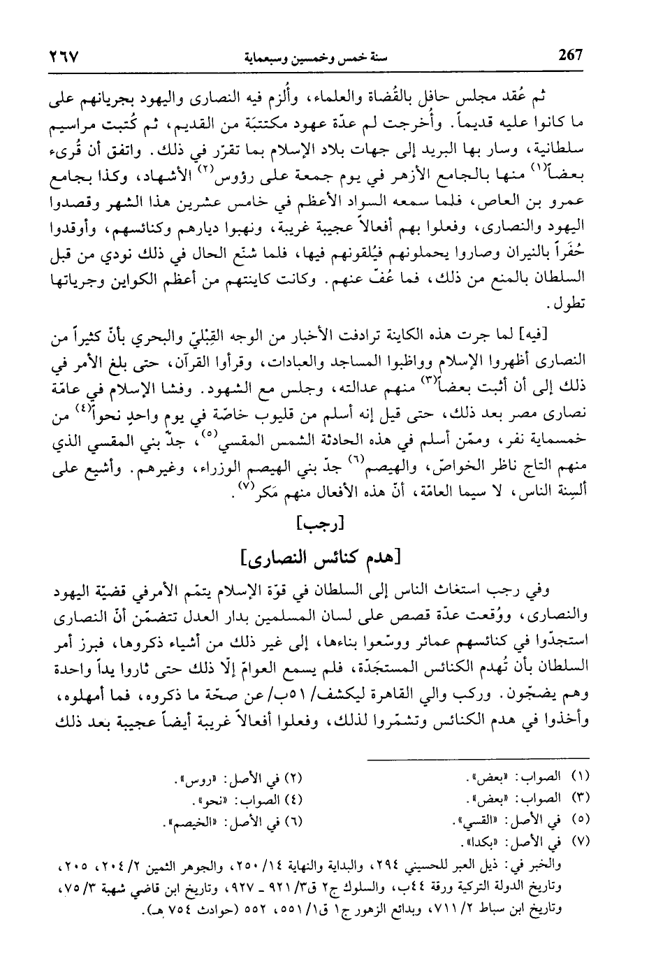 وفي رجب استغاث الناس إلى السلطان في قوّة الإسلام يتمّم الأمر في قضيّة اليهود والنصارى، ووقعت عدّة قصص على لسان المسلمين بدار العدل تتضمّن أنّ النصارى استجدّوا في كنائسهم عمائر ووسّعوا بناءها، إلى غير ذلك من أشياء ذكروها، فبرز أمر السلطان بأن تهدم الكنائس المستجدّة، فلم يسمع العوامّ إلاّ ذلك حتى ثاروا يدا واحدة وهم يضجّون. وركب والي القاهرة ليكشف / 51 ب / عن صحّة ما ذكروه، فما أمهلوه، وأخذوا في هدم الكنائس وتشمّروا لذلك، وفعلوا أفعالا غريبة أيضا عجيبة بعد ذلك