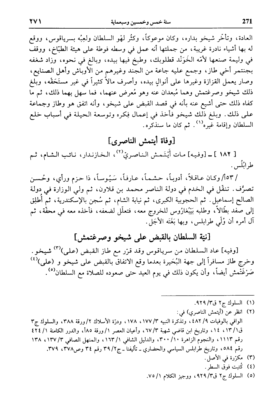 (¬2) انظر عن (أيتمش الناصري) في: الوافي بالوفيات 9/ 482، وتذكرة النبيه 3/ 177، 178، ودرّة الأسلاك 2 / ورقة 388، والسلوك ج 3 ق 1/ 13، 14، وتاريخ ابن قاضي شهبة 3/ 67، وأعيان العصر 1 / ورقة 85 أ، والدرر الكامنة 1/ 424 رقم 1113، والنجوم الزاهرة 10/ 300، والدليل الشافي 1/ 163، والمنهل الصافي 3/ 137، 138 رقم 584، وتاريخ طرابلس السياسي والحضاري - تأليفنا - ج 2/ 39 رقم 34 وص 378، 379.