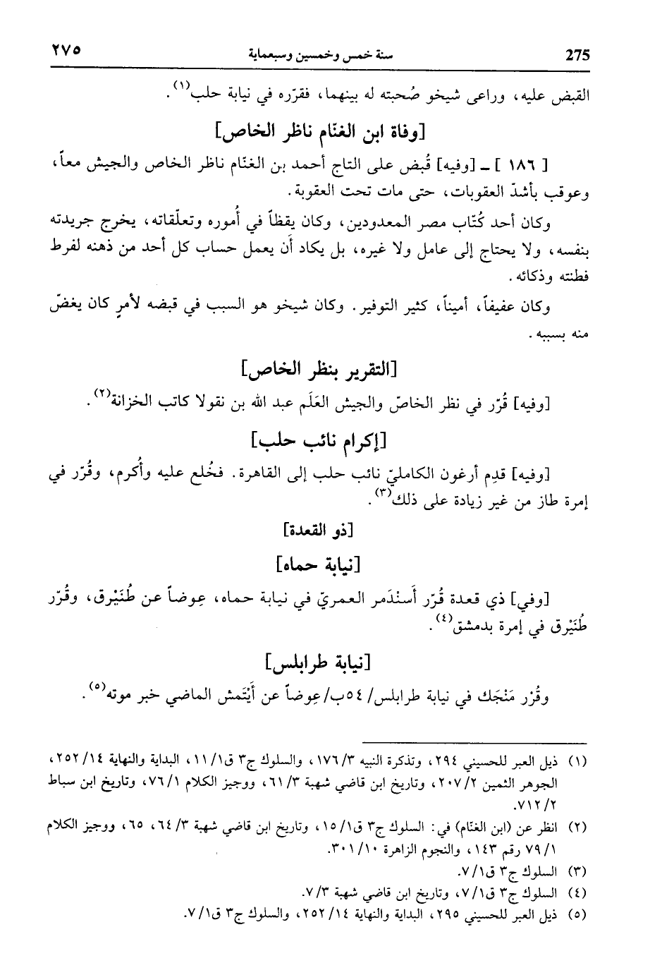 [186]-، [وفيه] قبض على التاج أحمد بن الغنّام ناظر الخاص والجيش معا، وعوقب بأشدّ العقوبات، حتى مات تحت العقوبة.