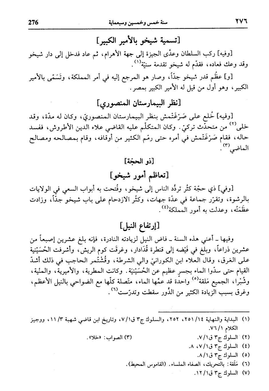 [وفي] ذي حجّة كثر تردّد الناس إلى شيخو، وفتحت به أبواب السعي في الولايات بالرشوة، وتقرّر جماعة في عدّة جهات، وكثر الازدحام على باب شيخو جدّا، وزادت عظمته، وعدلت به أمور المملكة (¬4).