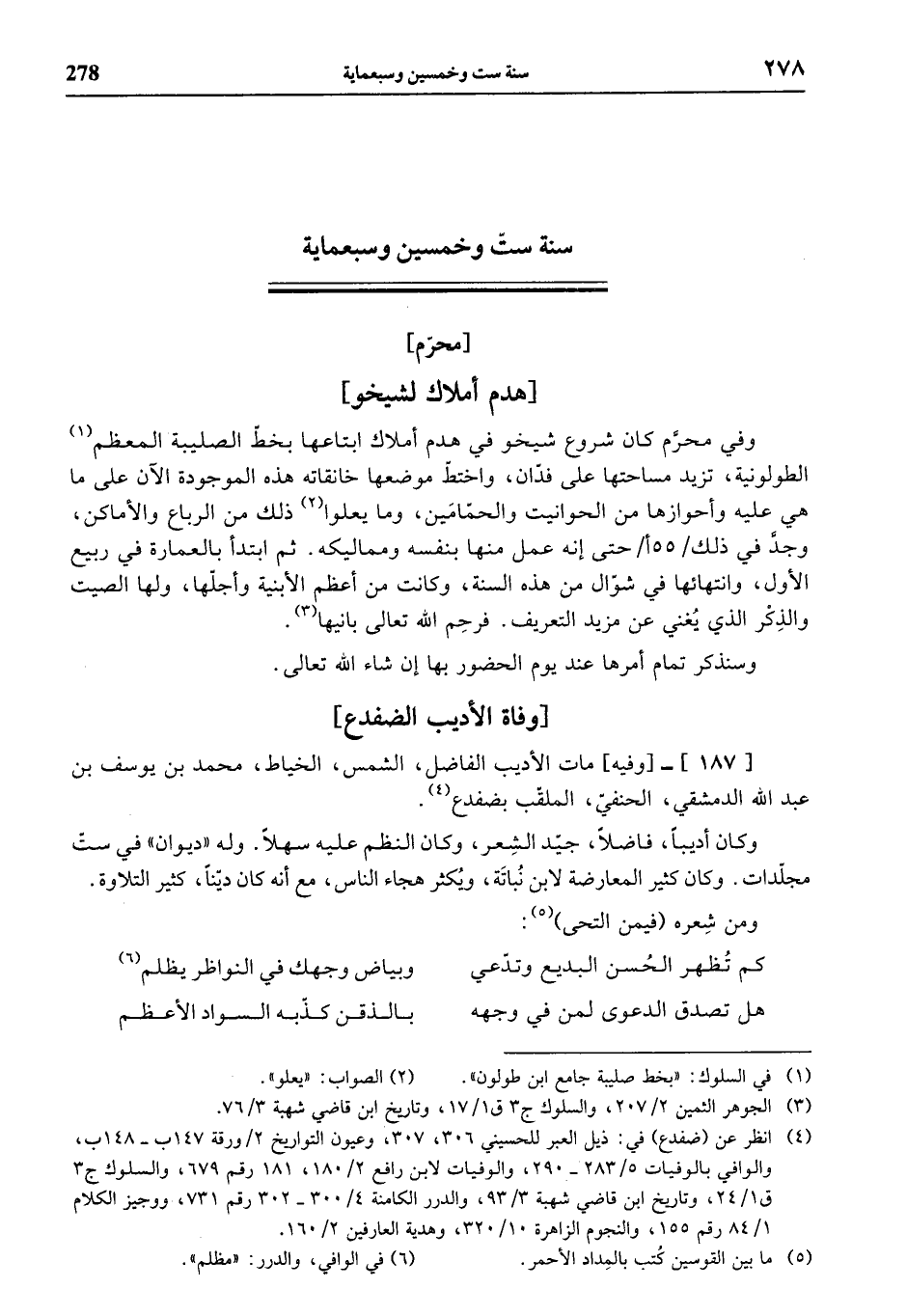 (¬4) انظر عن (ضفدع) في: ذيل العبر للحسيني 306، 307، وعيون التواريخ 2 / ورقة 147 ب - 148 ب، والوافي بالوفيات 5/ 283 - 290، والوفيات لابن رافع 2/ 180، 181 رقم 679، والسلوك ج 3 ق 1/ 24، وتاريخ ابن قاضي شهبة 3/ 93، والدرر الكامنة 4/ 300 - 302 رقم 731، ووجيز الكلام 1/ 84 رقم 155، والنجوم الزاهرة 10/ 320، وهدية العارفين 2/ 160.