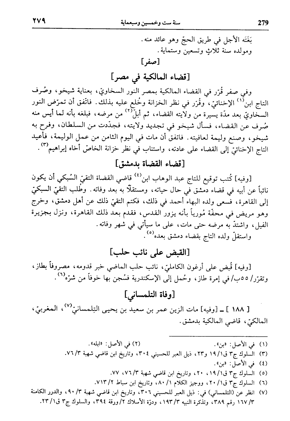 (¬7) انظر عن (التلمساني) في: ذيل العبر للحسيني 306، وتاريخ ابن قاضي شهبة 3/ 90، والدرر الكامنة 3/ 167 رقم 389، وتذكرة النبيه 3/ 193، ودرّة الأسلاك 2 / ورقة 394، والسلوك ج 3 ق 1/ 23.