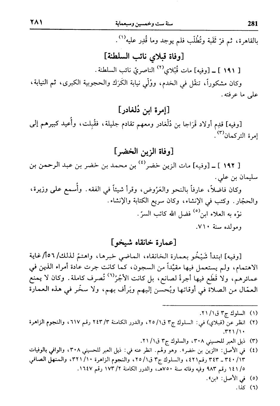 (¬3) ذيل العبر للحسيني 308، والسلوك ج 3 ق 1/ 21.