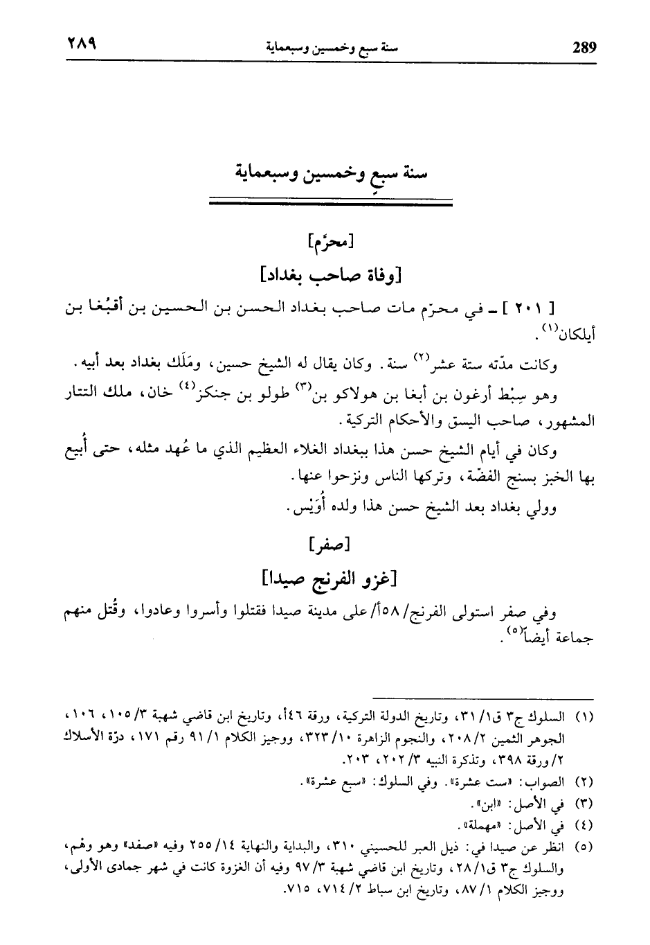 (¬5) انظر عن صيدا في: ذيل العبر للحسيني 310، والبداية والنهاية 14/ 255 وفيه «صفد» وهو وهم، والسلوك ج 3 ق 1/ 28، وتاريخ ابن قاضي شهبة 3/ 97 وفيه أن الغزوة كانت في شهر جمادى الأولى، ووجيز الكلام 1/ 87، وتاريخ ابن سباط 2/ 714، 715.