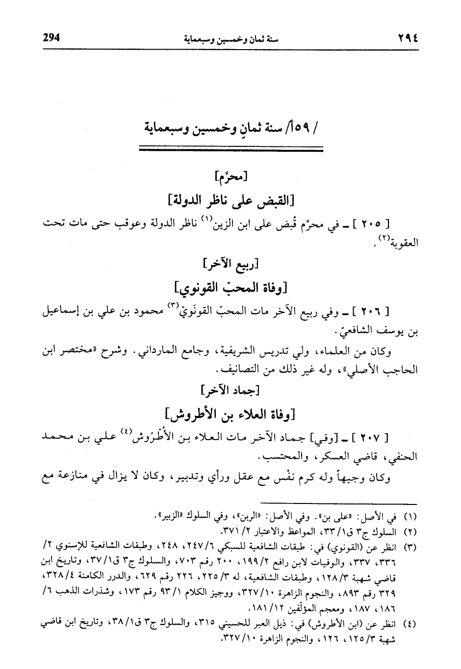 [205]- في محرّم قبض على ابن الزين (¬1) ناظر الدولة وعوقب حتى مات تحت العقوبة (¬2).