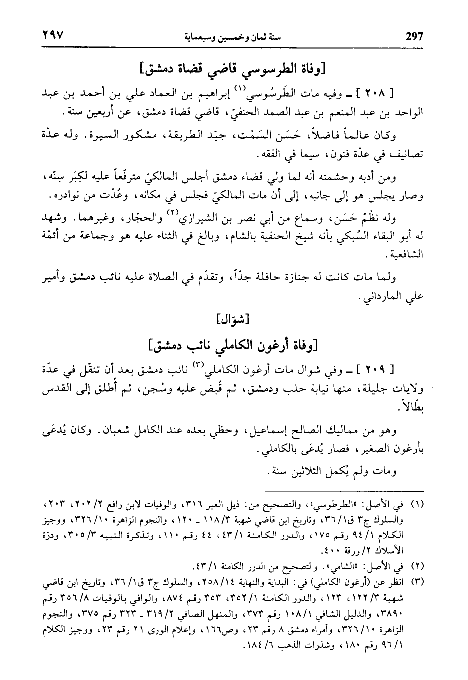 [209]- وفي شوال مات أرغون الكاملي (¬3) نائب دمشق بعد أن تنقّل في عدّة ولايات جليلة، منها نيابة حلب ودمشق، ثم قبض عليه وسجن، ثم أطلق إلى القدس بطّالا.
