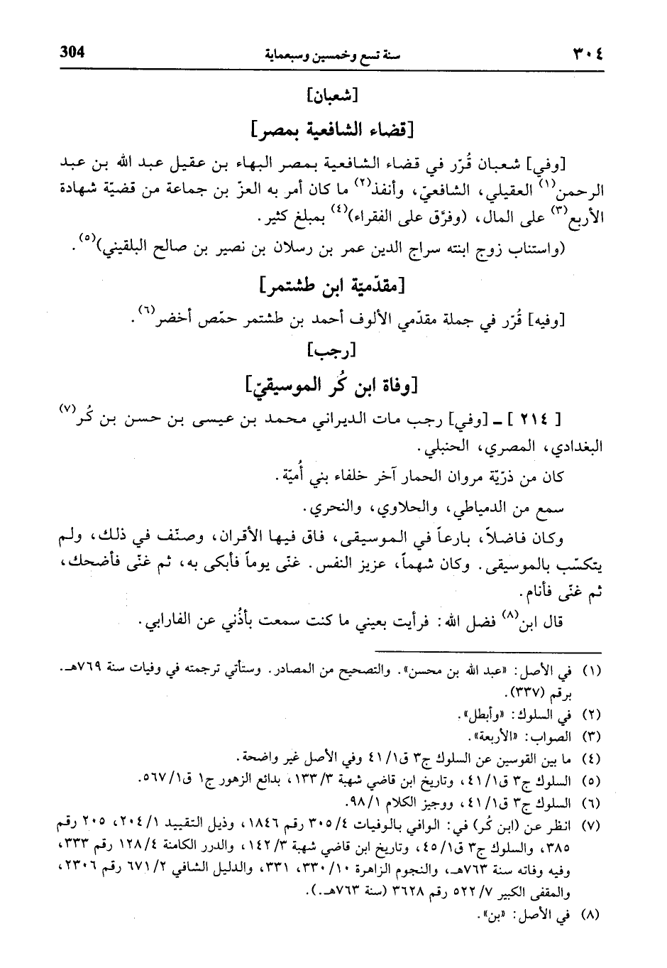 (¬7) انظر عن (ابن كر) في: الوافي بالوفيات 4/ 305 رقم 1846، وذيل التقييد 1/ 204، 205 رقم 385، والسلوك ج 3 ق 1/ 45، وتاريخ ابن قاضي شهبة 3/ 142، والدرر الكامنة 4/ 128 رقم 333، وفيه وفاته سنة 763 هـ، والنجوم الزاهرة 10/ 330، 331، والدليل الشافي 2/ 671 رقم 2306، والمقفى الكبير 7/ 522 رقم 3628 (سنة 763 هـ.).
