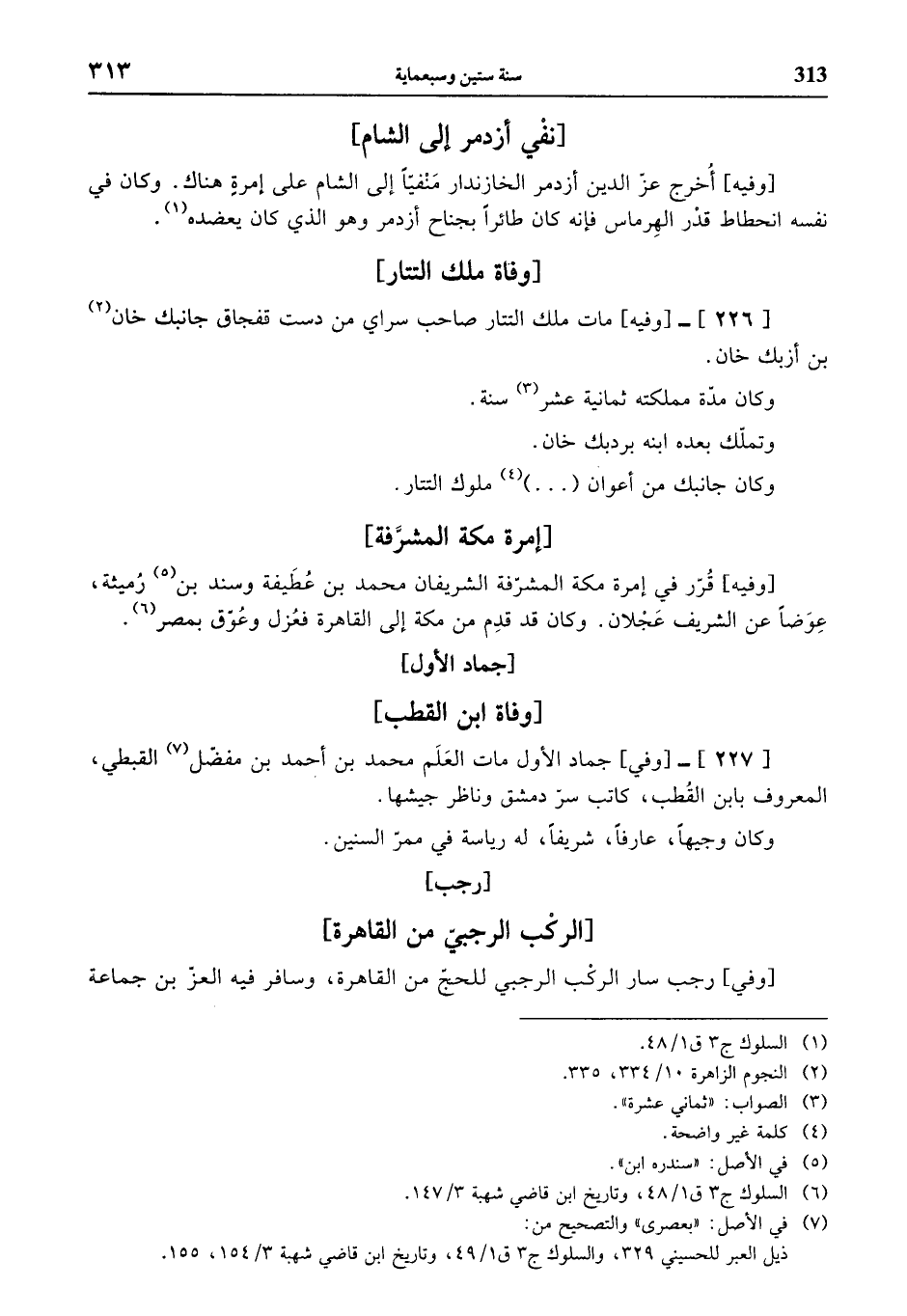 [226]-، [وفيه] مات ملك التتار صاحب سراي من دست قفجاق جانبك خان (¬2) بن أزبك خان.