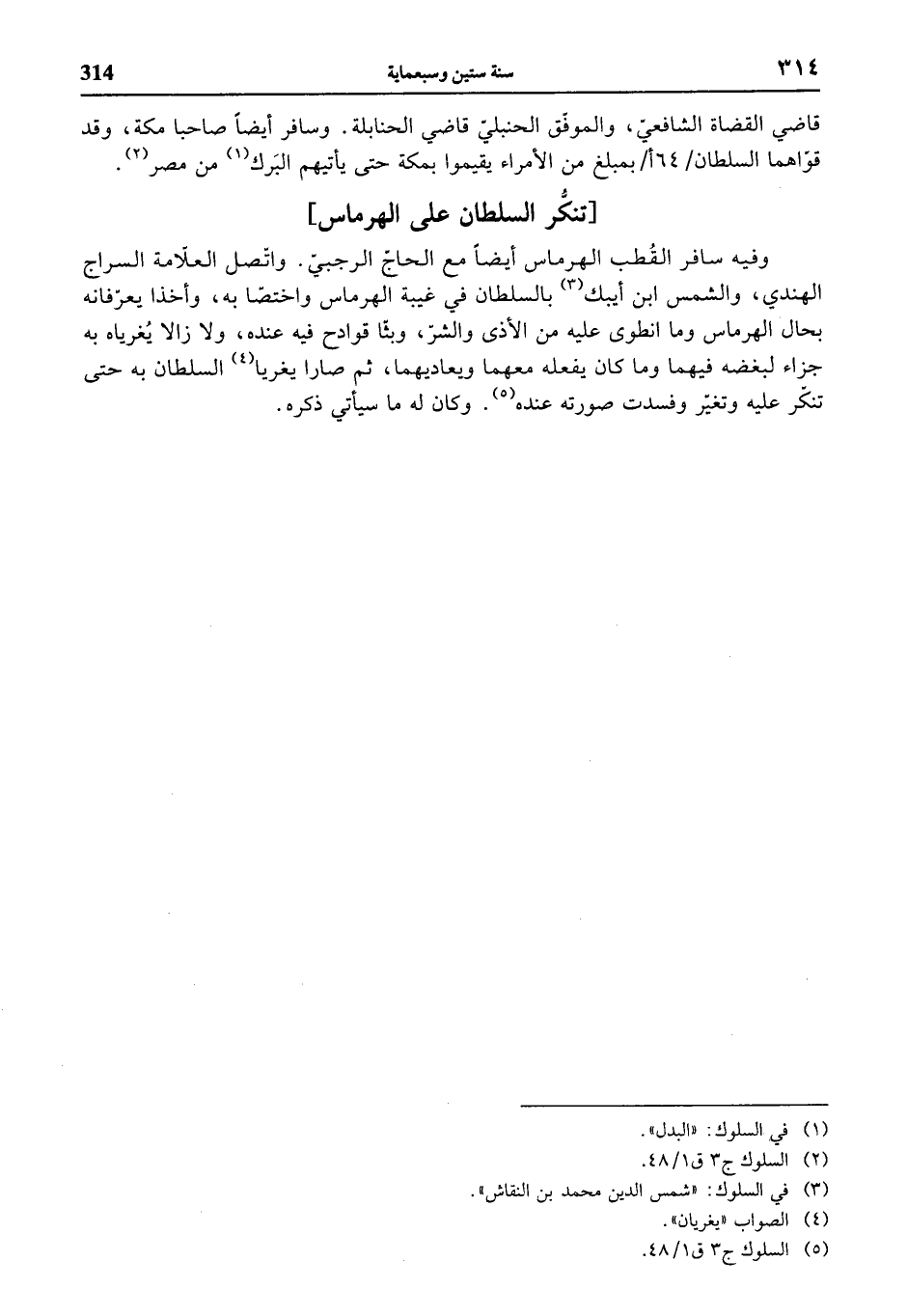 قاضي القضاة الشافعيّ، والموفّق الحنبليّ قاضي الحنابلة. وسافر أيضا صاحبا مكة، وقد قوّاهما السلطان / 64 أ / بمبلغ من الأمراء يقيموا بمكة حتى يأتيهم البرك (¬1) من مصر (¬2).