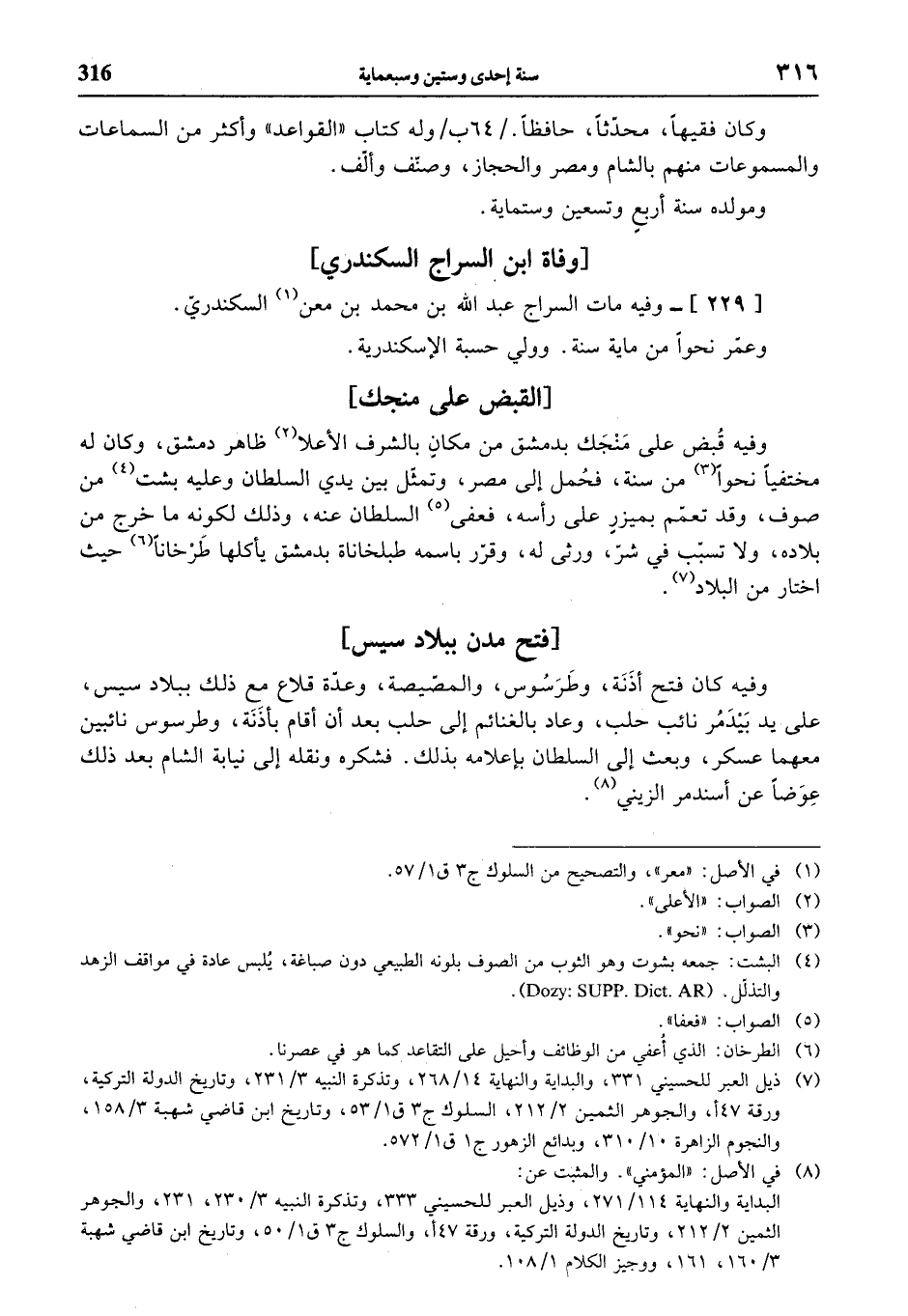 (¬7) ذيل العبر للحسيني 331، والبداية والنهاية 14/ 268، وتذكرة النبيه 3/ 231، وتاريخ الدولة التركية، ورقة 47 أ، والجوهر الثمين 2/ 212، السلوك ج 3 ق 1/ 53، وتاريخ ابن قاضي شهبة 3/ 158، والنجوم الزاهرة 10/ 310، وبدائع الزهور ج 1 ق 1/ 572.