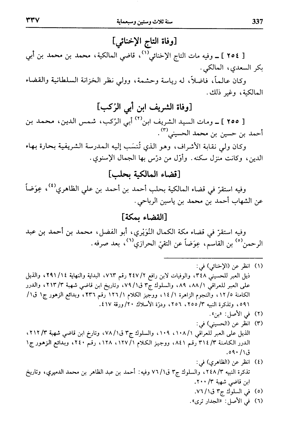 (¬1) انظر عن (الإخنائي) في: ذيل العبر للحسيني 348، والوفيات لابن رافع 2/ 247 رقم 763، البداية والنهاية 14/ 291، والذيل على العبر للعراقي 1/ 88، 89، والسلوك ج 3 ق 1/ 79، وتاريخ ابن قاضي شهبة 3/ 213، والدرر الكامنة 5/ 12، والنجوم الزاهرة 1/ 14، ووجيز الكلام 1/ 126 رقم 236، وبدائع الزهور ج 1 ق 1/ 591، وتذكرة النبيه 3/ 255، 256، ودرّة الأسلاك 20 / ورقة 417.