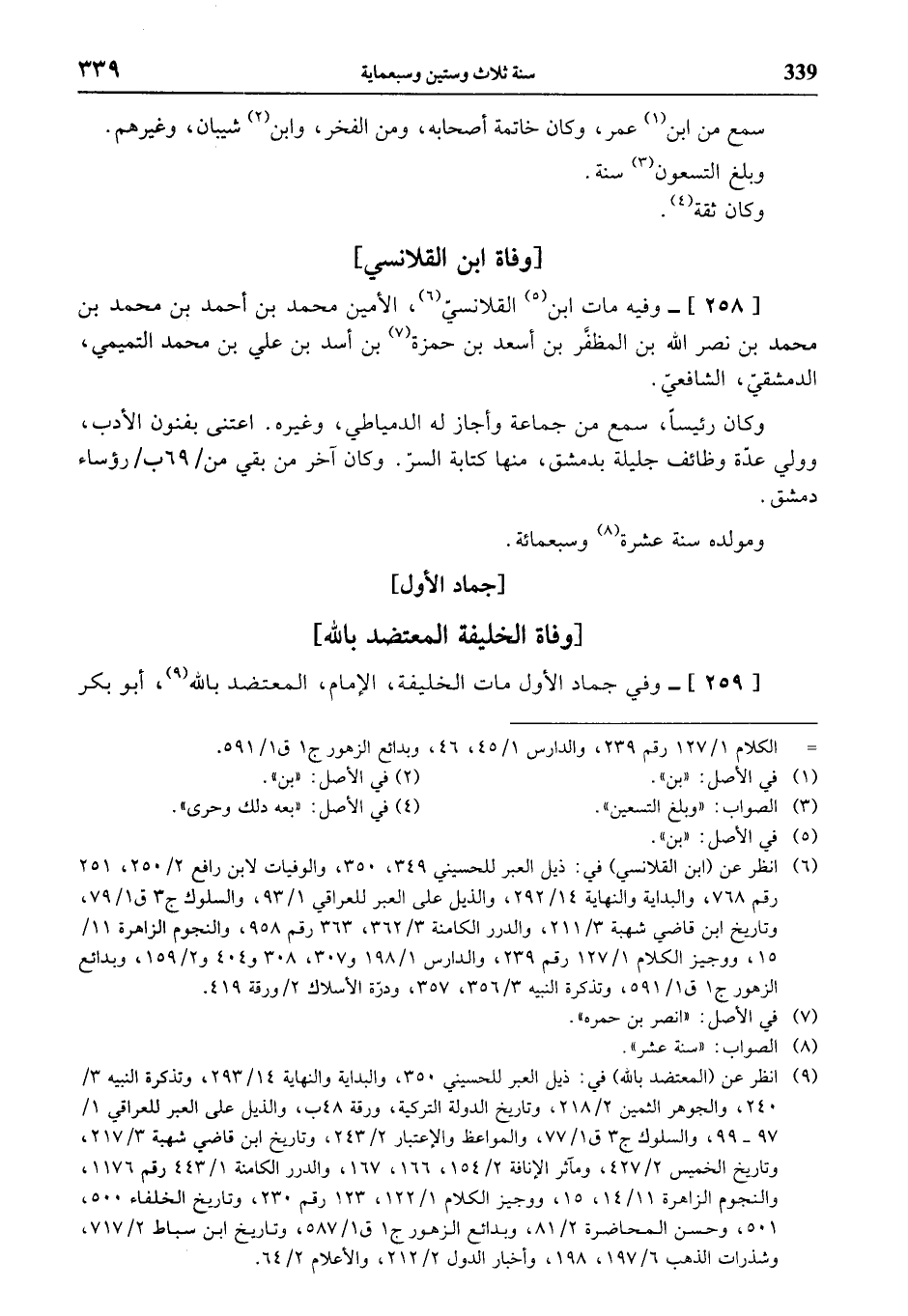 [258]- وفيه مات ابن (¬5) القلانسيّ (¬6)، الأمين محمد بن أحمد بن محمد بن محمد بن نصر الله بن المظفّر بن أسعد بن حمزة (¬7) بن أسد بن علي بن محمد التميمي، الدمشقيّ، الشافعيّ.