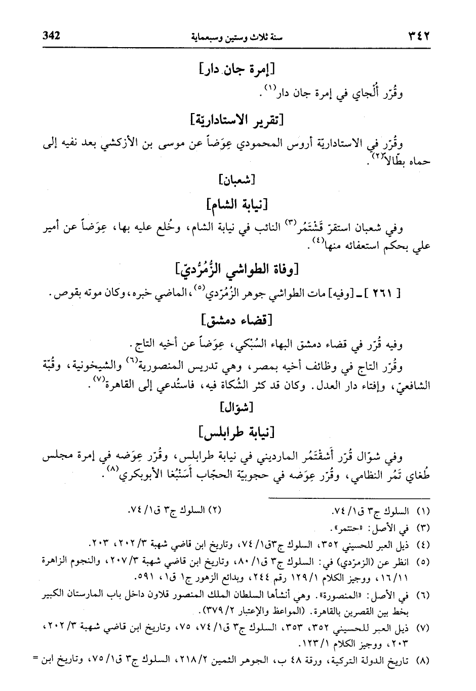 (¬4) ذيل العبر للحسيني 352، السلوك ج 3 ق 1/ 74، وتاريخ ابن قاضي شهبة 3/ 202، 203.