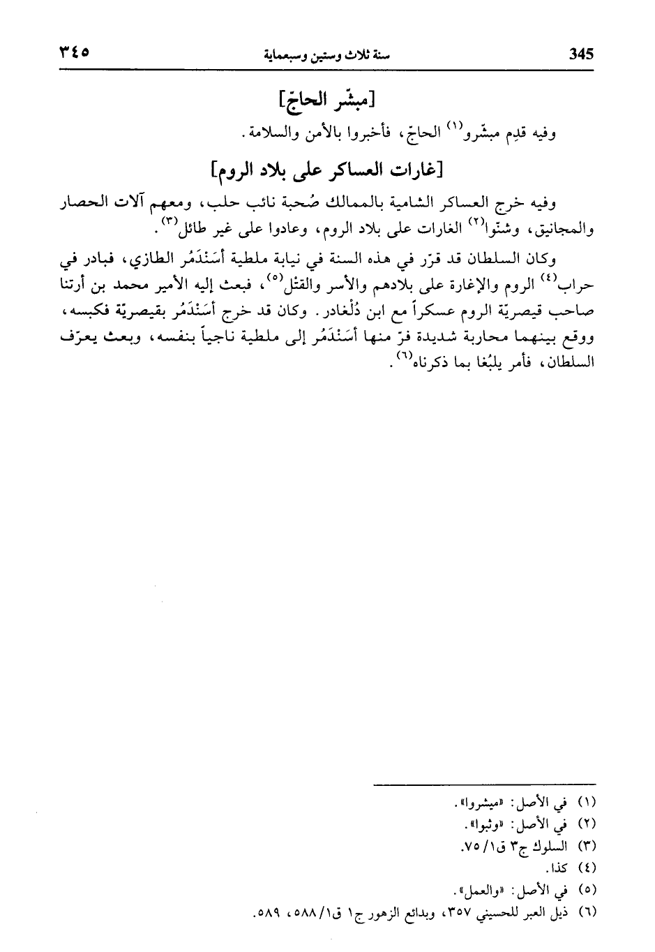 (¬6) ذيل العبر للحسيني 357، وبدائع الزهور ج 1 ق 1/ 588، 589.