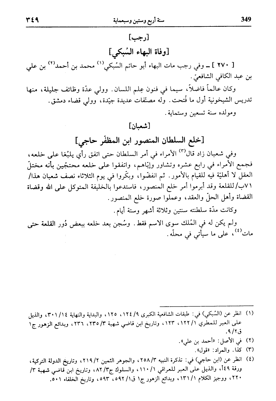 (¬1) انظر عن (السبكي) في: طبقات الشافعية الكبرى 9/ 124، 125، والبداية والنهاية 14/ 301، والذيل على العبر للمطري 1/ 122، 123، وتاريخ ابن قاضي شهبة 3/ 235، 236، وبدائع الزهور ج 1 ق 2/ 9.