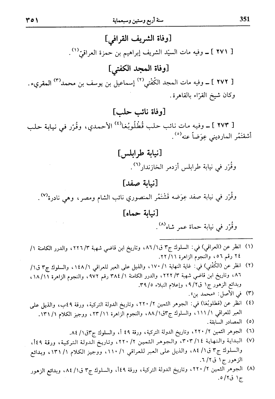 (¬2) انظر عن (الكفتي) في: غاية النهاية 1/ 170، والذيل على العبر للعراقي 1/ 148، والسلوك ج 3 ق 1/ 86، وتاريخ ابن قاضي شهبة 3/ 222، والدرر الكامنة 1/ 384 رقم 972، والنجوم الزاهرة 11/ 18، وبدائع الزهور ج 1 ق 2/ 9، وإعلام النبلاء 5/ 39.