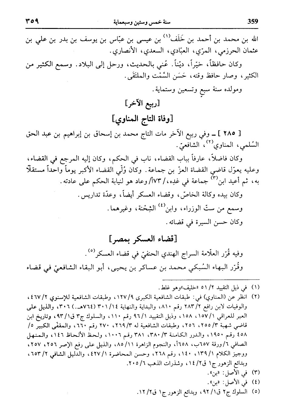 (¬2) انظر عن (المناوي) في: طبقات الشافعية الكبرى 9/ 127، وطبقات الشافعية للإسنوي 2/ 467، والوفيات لابن رافع 2/ 283 رقم 810، والبداية والنهاية 14/ 301 (764 هـ.) 306، والذيل على العبر للعراقي 1/ 157، 158، وذيل التقييد 1/ 96 رقم 110، والسلوك ج 3 ق 1/ 93، وتاريخ ابن قاضي شهبة 3/ 255، 256، وطبقات الشافعية له 3/ 269، 270 رقم 660، والمقفّى الكبير 5/ 458 رقم 1950، والدرر الكامنة 3/ 380، 381 رقم 1006، ولحظ الألحاظ 146، والمنهل الصافي 6 / ورقة 657 ب، 658 أ، والنجوم الزاهرة 11/ 85، والذيل على رفع الإصر 256، 257، ووجيز الكلام 1/ 139، 140، رقم 268، وحسن المحاضرة 1/ 427، والدليل الشافي 2/ 653، وبدائع الزهور ج 1 ق 2/ 14، وشذرات الذهب 6/ 205.