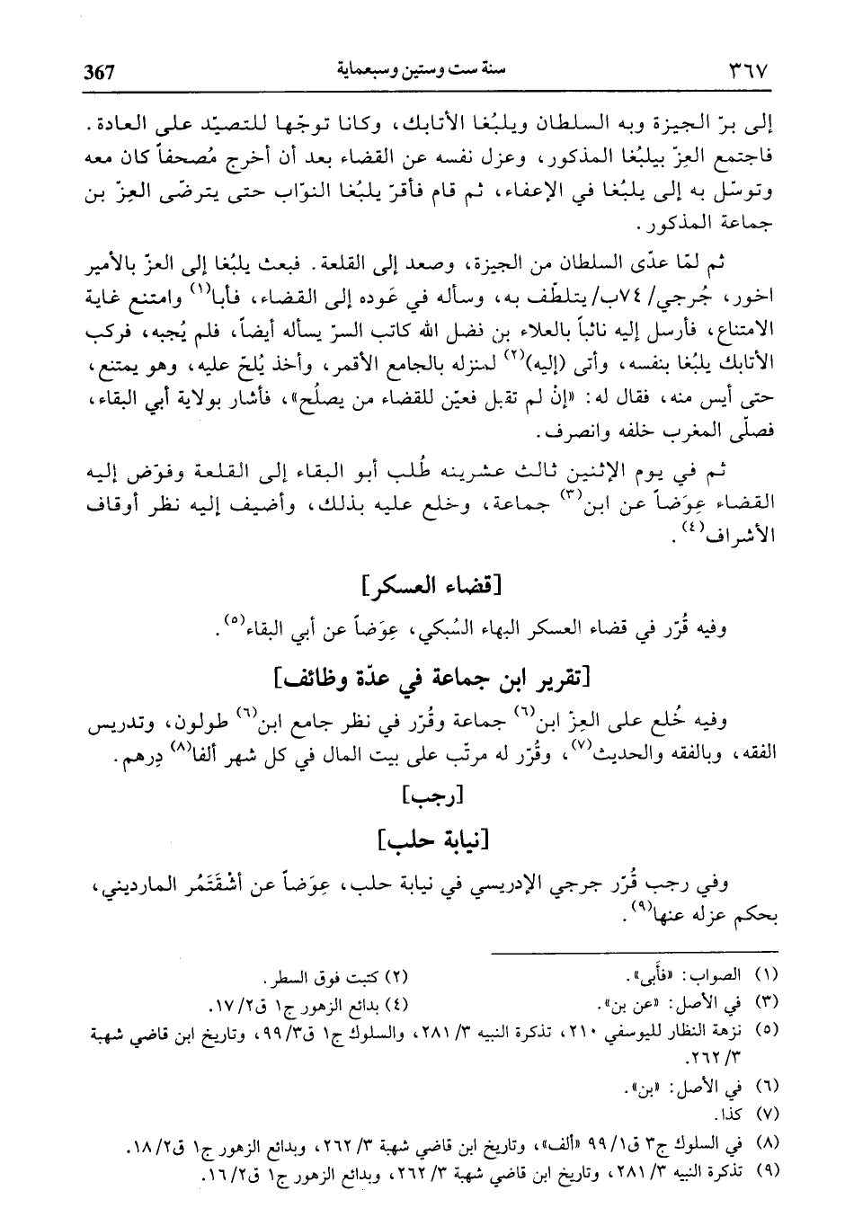 إلى برّ الجيزة وبه السلطان ويلبغا الأتابك، وكانا توجّها للتصيّد على العادة. فاجتمع العزّ بيلبغا المذكور، وعزل نفسه عن القضاء بعد أن أخرج مصحفا كان معه وتوسّل به إلى يلبغا في الإعفاء، ثم قام فأقرّ يلبغا النوّاب حتى يترضّى العزّ بن جماعة المذكور.