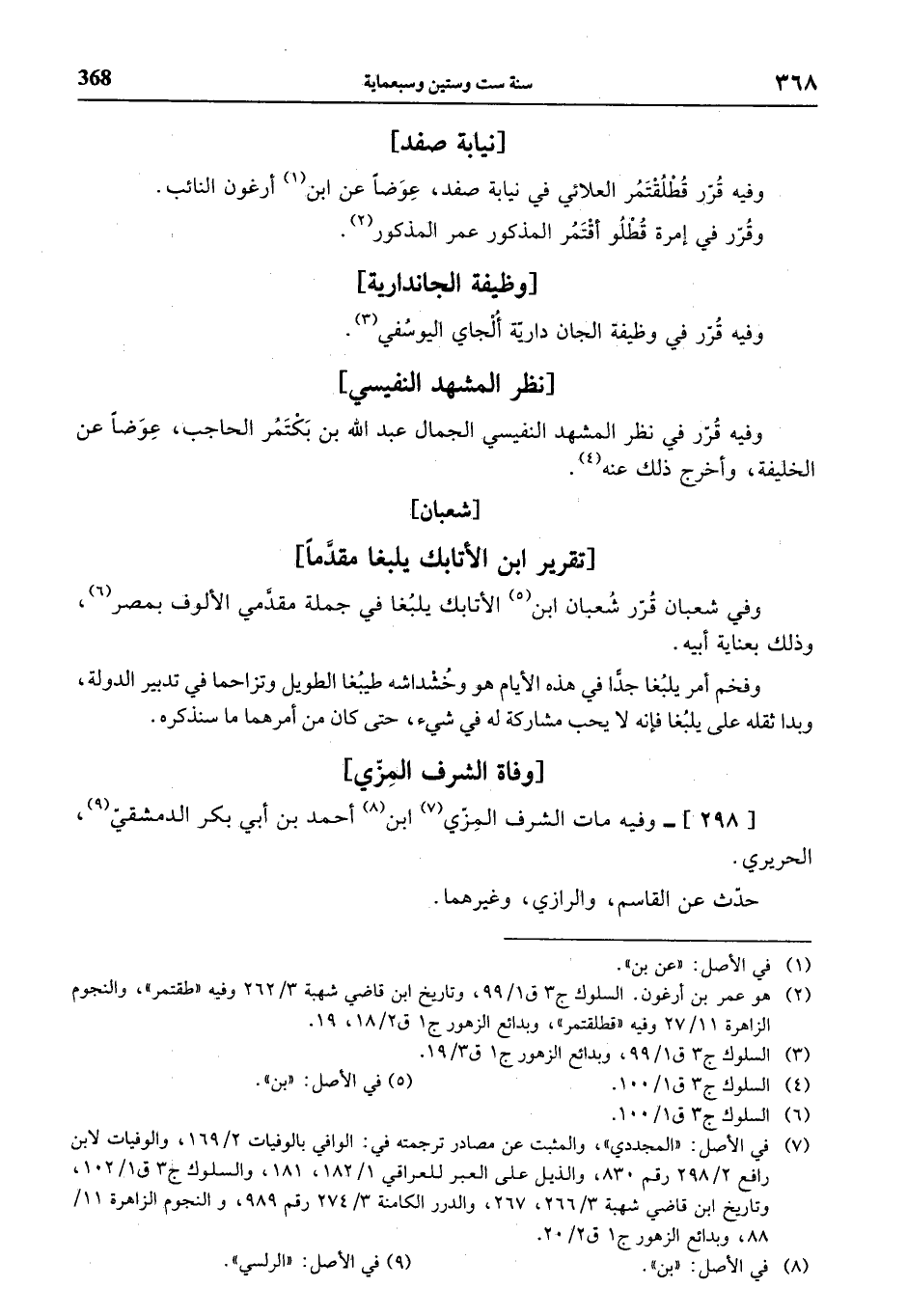 وفيه قرّر في نظر المشهد النفيسي الجمال عبد الله بن بكتمر الحاجب، عوضا عن الخليفة، وأخرج ذلك عنه (¬4).
