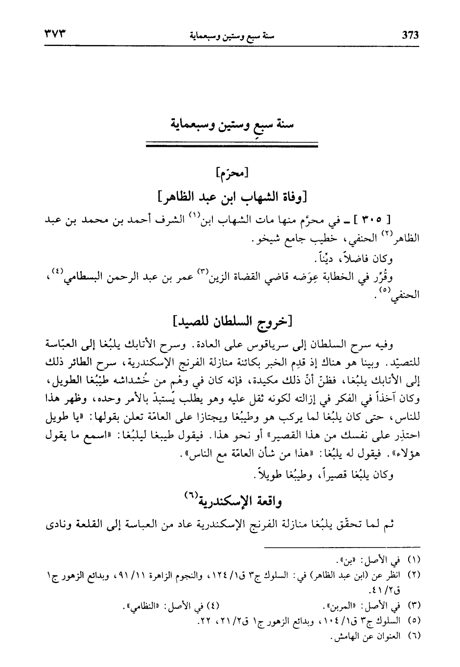 (¬5) السلوك ج 3 ق 1/ 104، وبدائع الزهور ج 1 ق 2/ 21، 22.