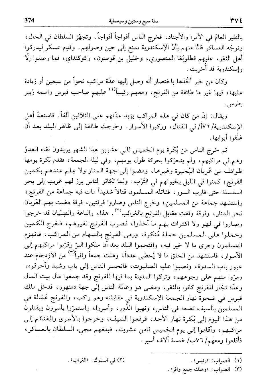 ثم خرج الناس من بكرة يوم الخميس ثاني عشرين هذا الشهر يريدون لقاء العدوّ وهم في مراكبهم، ولم يتحرّكوا بحركة طول يومهم، وفي ليلة الجمعة، فقدم بكرة يومها طوائف من عربان البحيرة وغيرها، ومضوا إلى جهة المنار ولا علم عندهم بكمين الفرنج، كمنوا في الليل بخيولهم في الترب. ولما تكاثر الناس برز لهم غريب إلى بحر السلسلة حتى قارب السور، فقاتله المسلمون قتالا شديدا مات فيه جماعة من الفرنج، واستشهد جماعة من المسلمين، وخرج الناس وصاروا فرقتين، فرقة مضت بهم العربان نحو المنار، وفرقة وقفت مقابل الفرنج بالغرائب (¬2). هذا، والباعة والصبيان قد خرجوا وصاروا في لهو ولا اكتراث بهم ما أخذوا، فضرب الفرنج نفيرهم، فخرج الكمين وحملوا على المسلمين حملة منكرة، ورمى الفرنج بالسهام من المراكب، فانهزم المسلمون وجرى ما لا خير فيه، واقتحموا البلد بعد أن ملكوا البرّ وقرّبوا مراكبهم إلى الأسوار، فاستشهد من الخلق ما لا يحصى عددا، وهلك جمعا وافرا (¬3) من الازدحام عند عبور باب السدرة، ونصبوا عليه الصلبوت، فانحسر الناس إلى باب رشيد وأحرقوه، ومرّوا منهم على وجوههم، وتركوا المدينة بما فيها للفرنج وقد جمعوا مال بيت المال وعدّة تجّار للفرنج كانوا بالثغر، ومضى هو وعامّة الناس إلى جهة دمنهور، فدخل ملك قبرس في ضحوة نهار الجمعة الإسكندرية في مقابلته وهو راكب، والفرنج عمّالة في المسلمين بالسيف تضعه في الناس، ونهبوا الدّور، وأسروا، واستمرّوا يأسرون ويقتلون من هذا اليوم إلى بكرة نهار الأحد، فرفعوا السيف، وخرجوا بالأسرى والغنائم إلى مراكبهم، وأقاموا إلى يوم الخميس ثامن عشرينه، فبلغهم مجيء السلطان بالعساكر، فأقلعوا ومعهم / 76 ب / خمسة آلاف أسير.
