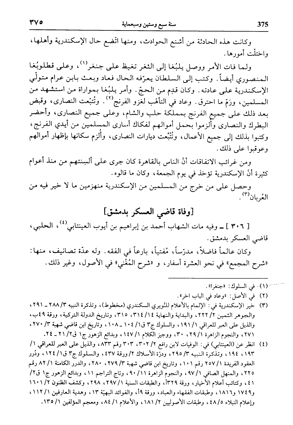 (¬3) خير الإسكندرية في: الإلمام بالأعلام للنويري السكندري (مخطوط)، وتذكرة النبيه 3/ 288 - 291، والجوهر الثمين 2/ 222، والبداية والنهاية 14/ 314، 315، وتاريخ الدولة التركية، ورقة 49 ب، والذيل على العبر للعراقي 1/ 191، والسلوك ج 3 ق 1/ 104 - 108، وتاريخ ابن قاضي شهبة 3/ 270، 271، والنجوم الزاهرة 1/ 29، 30، ووجيز الكلام 1/ 147، وبدائع الزهور ج 1 ق 2/ 21 - 24.