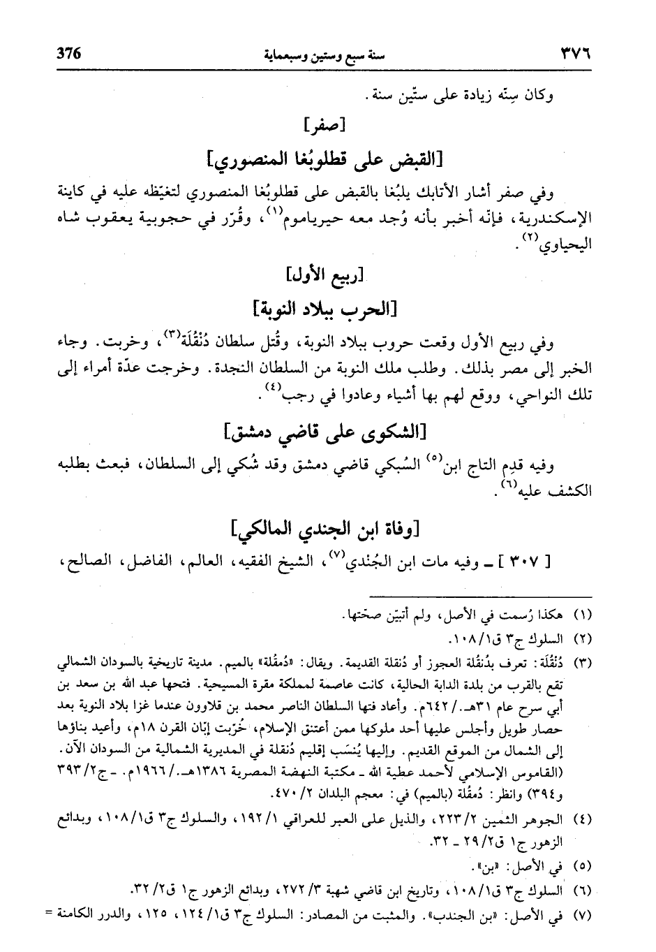وفي ربيع الأول وقعت حروب ببلاد النوبة، وقتل سلطان دنقلة (¬3)، وخربت. وجاء الخبر إلى مصر بذلك. وطلب ملك النوبة من السلطان النجدة. وخرجت عدّة أمراء إلى تلك النواحي، ووقع لهم بها أشياء وعادوا في رجب (¬4).