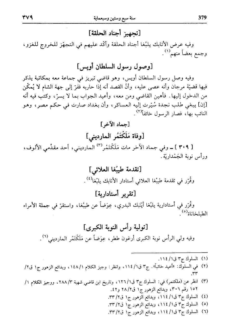 وفيه عرض الأتابك يلبغا أجناد الحلقة وأكّد عليهم في التجهّز للخروج للغزو، وجمع بعضا منهم (¬1).