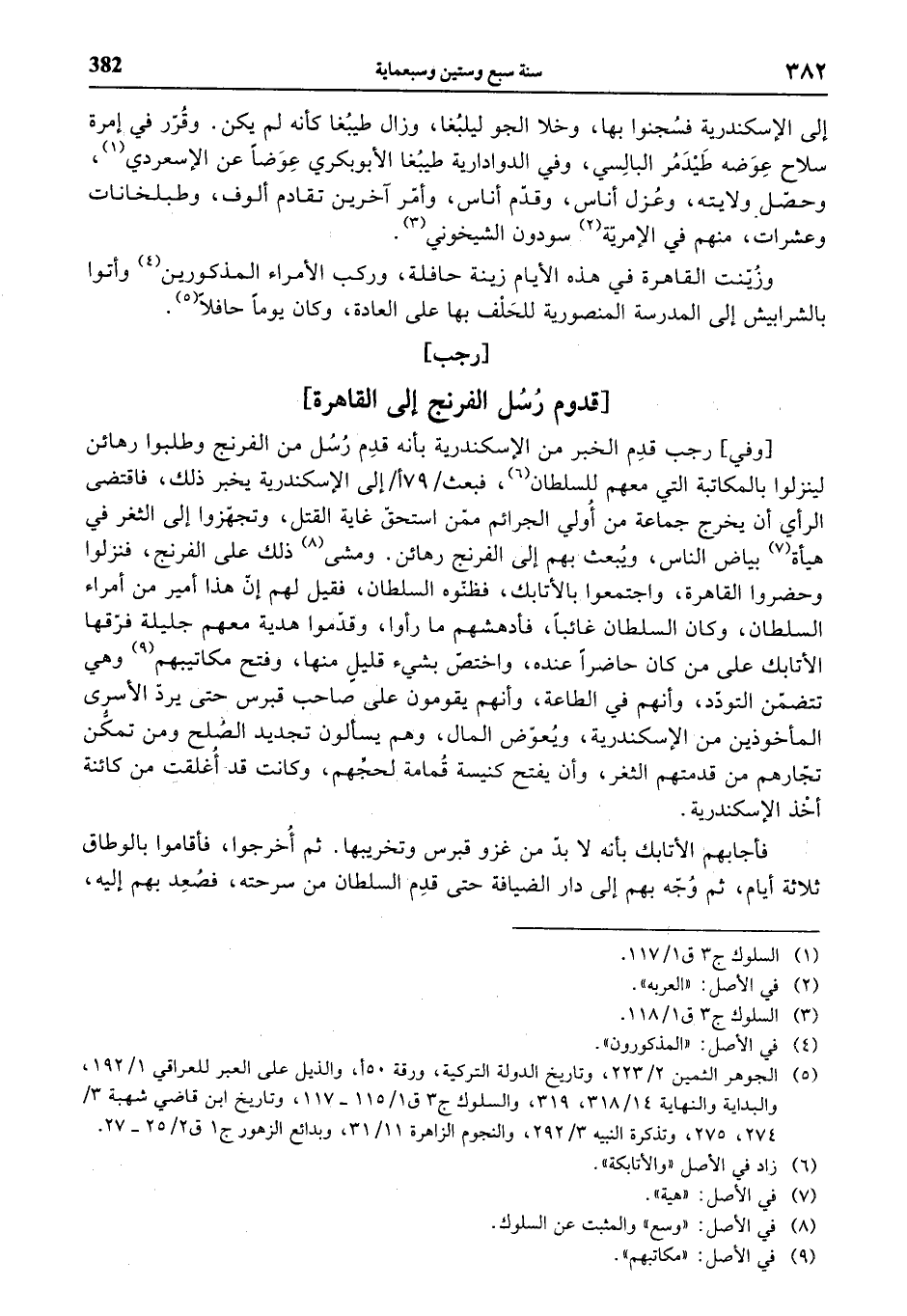 (¬5) الجوهر الثمين 2/ 223، وتاريخ الدولة التركية، ورقة 50 أ، والذيل على العبر للعراقي 1/ 192، والبداية والنهاية 14/ 318، 319، والسلوك ج 3 ق 1/ 115 - 117، وتاريخ ابن قاضي شهبة 3/ 274، 275، وتذكرة النبيه 3/ 292، والنجوم الزاهرة 11/ 31، وبدائع الزهور ج 1 ق 2/ 25 - 27.